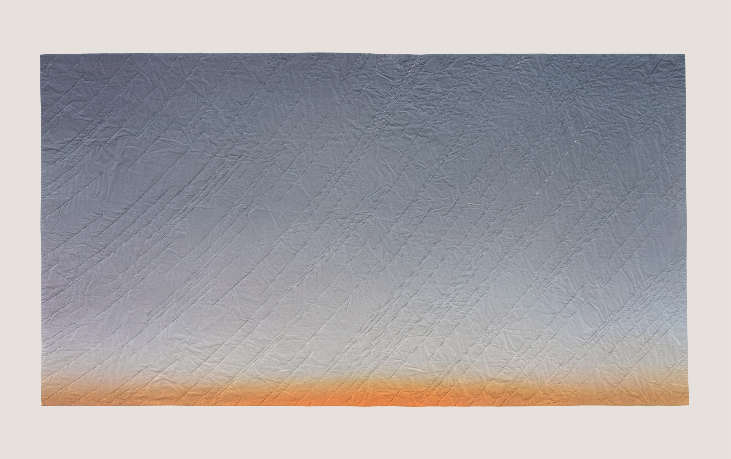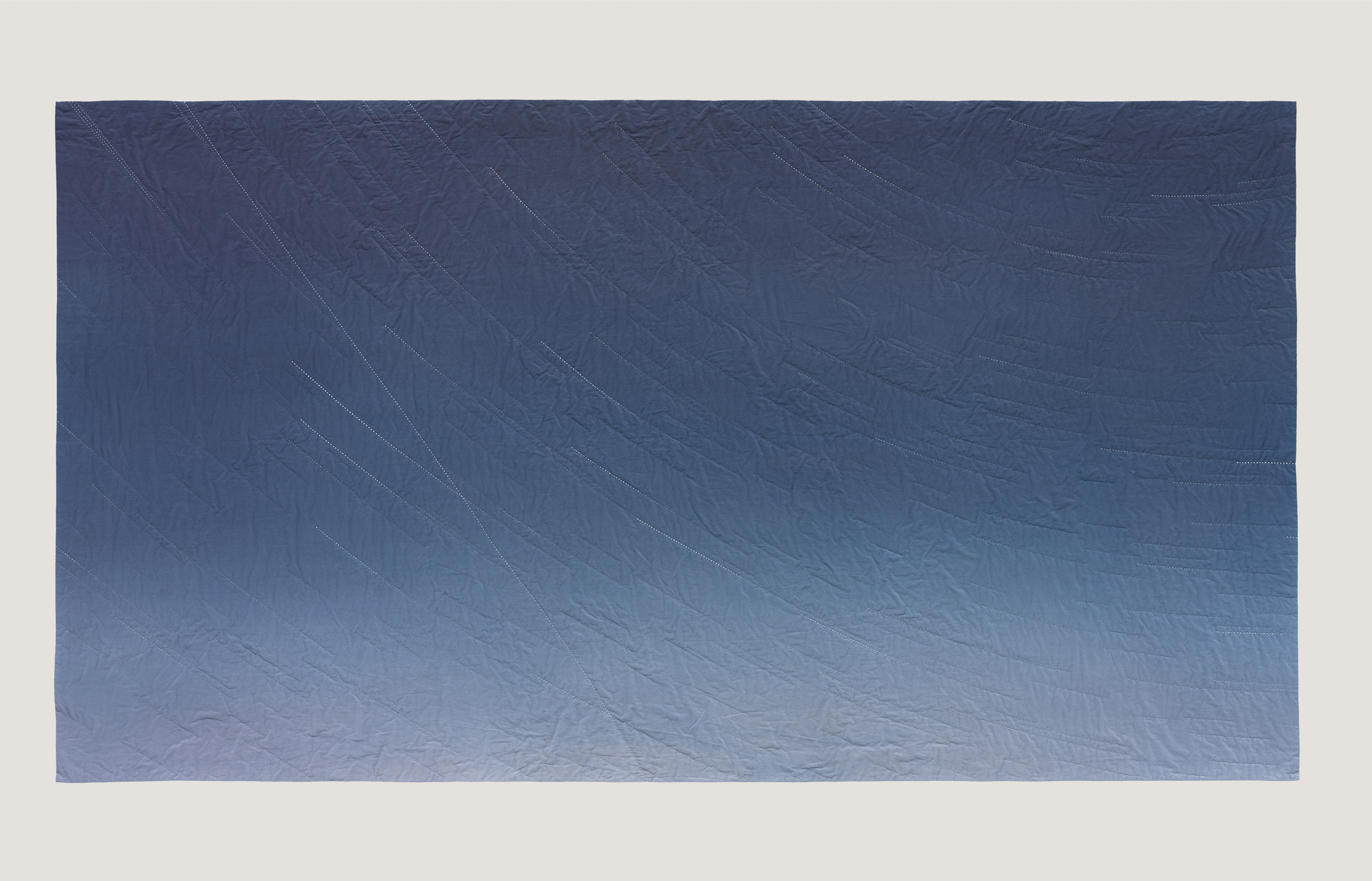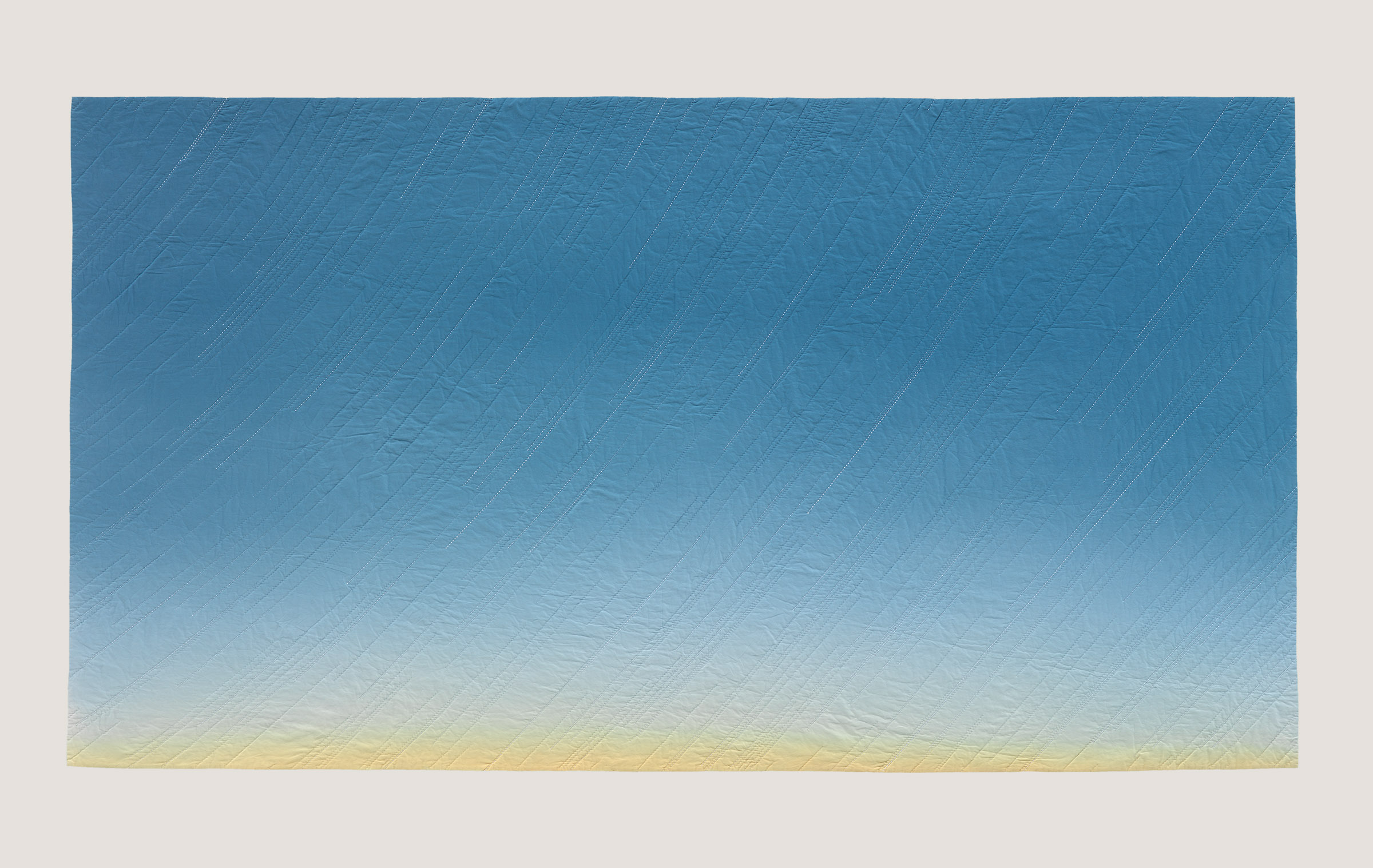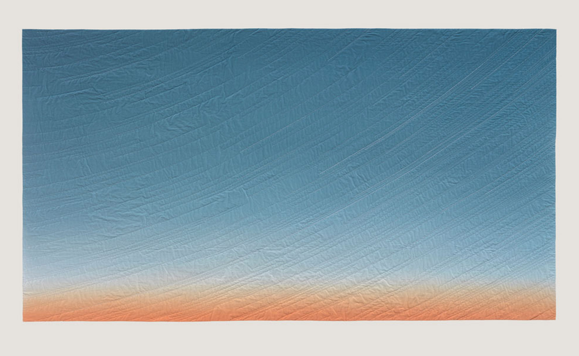 The two juxtaposed elements of light are shown in two layers: scenes at dawn and dusk are painted with dye onto fabric paired against the stitched lines of the stars fading with dawn or emerging with dusk. Here the first light of day—a harbinger of what is to come—is contrasted against the stitching of stars burning out in the sky, a symbol of what is lost.