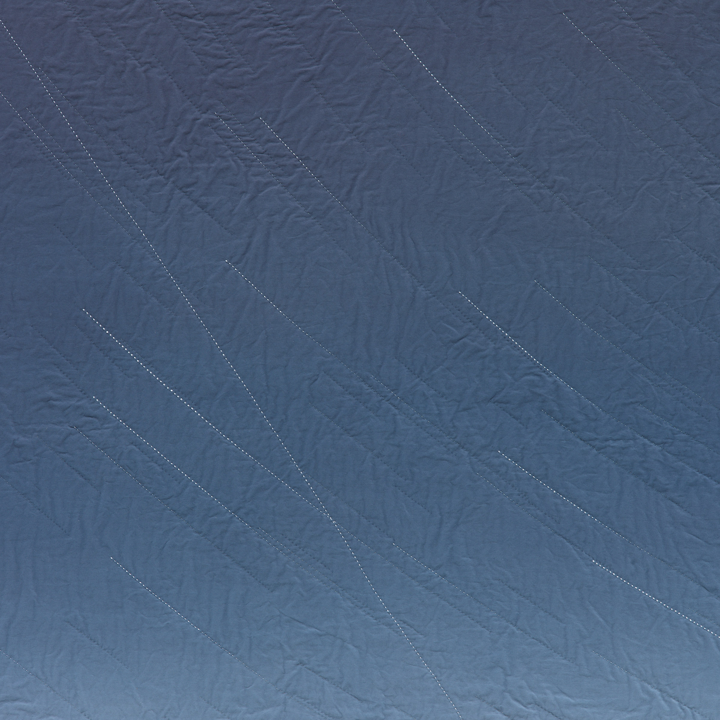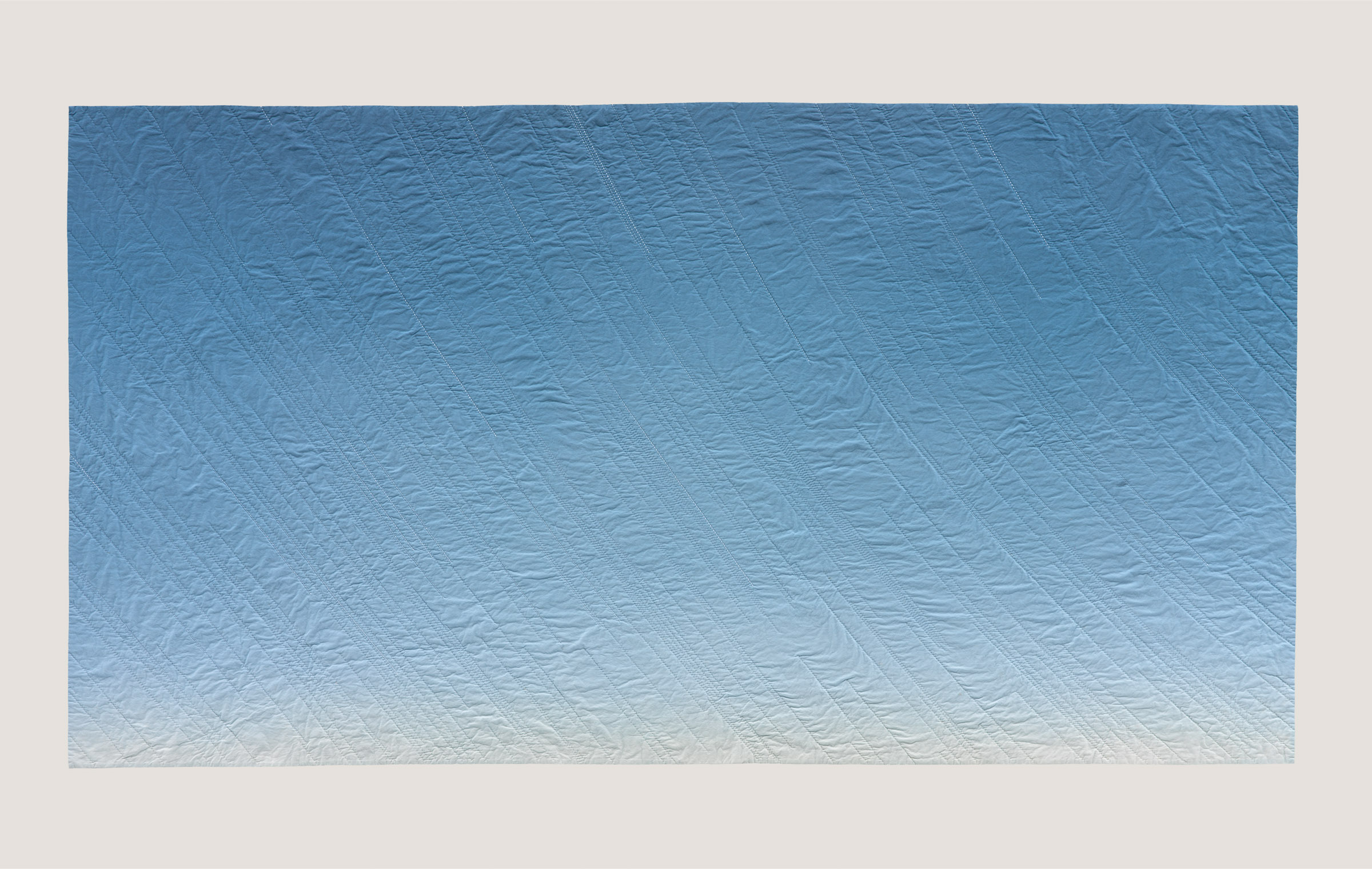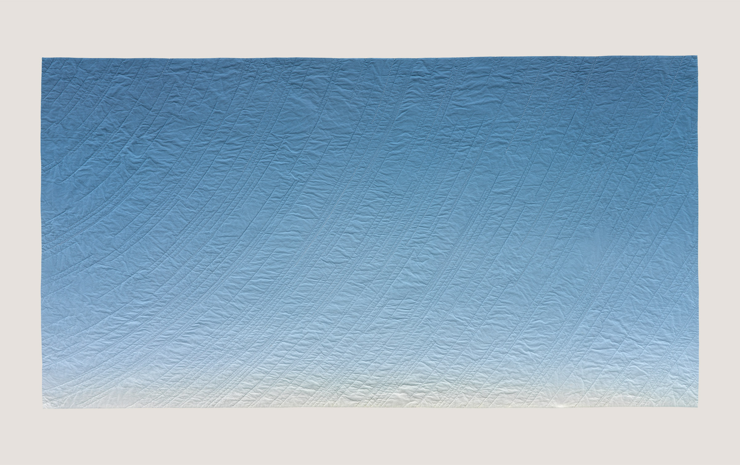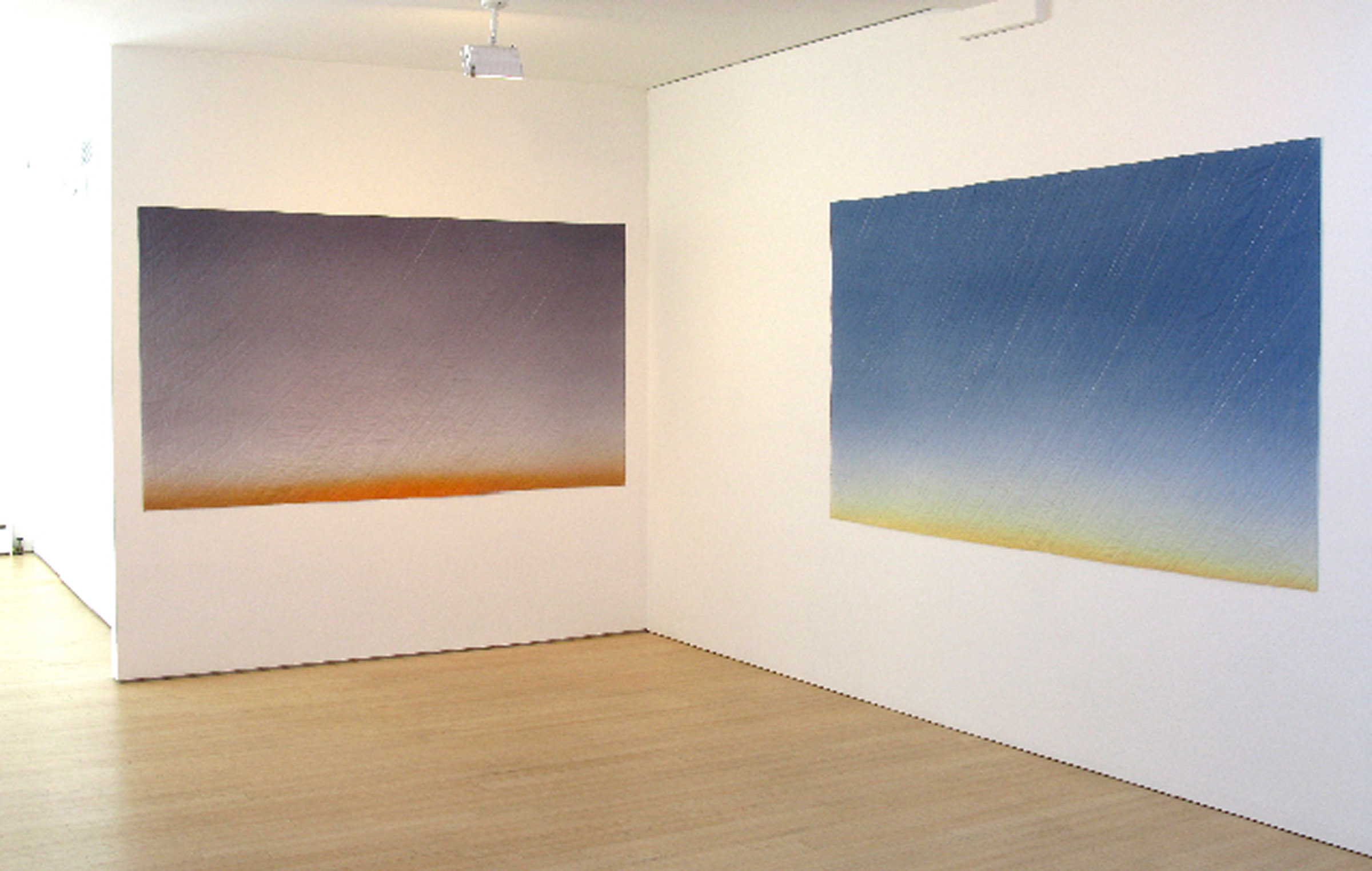The two juxtaposed elements of light are shown in two layers: scenes at dawn and dusk are painted with dye onto fabric paired against the stitched lines of the stars fading with dawn or emerging with dusk. Here the first light of day—a harbinger of what is to come—is contrasted against the stitching of stars burning out in the sky, a symbol of what is lost.