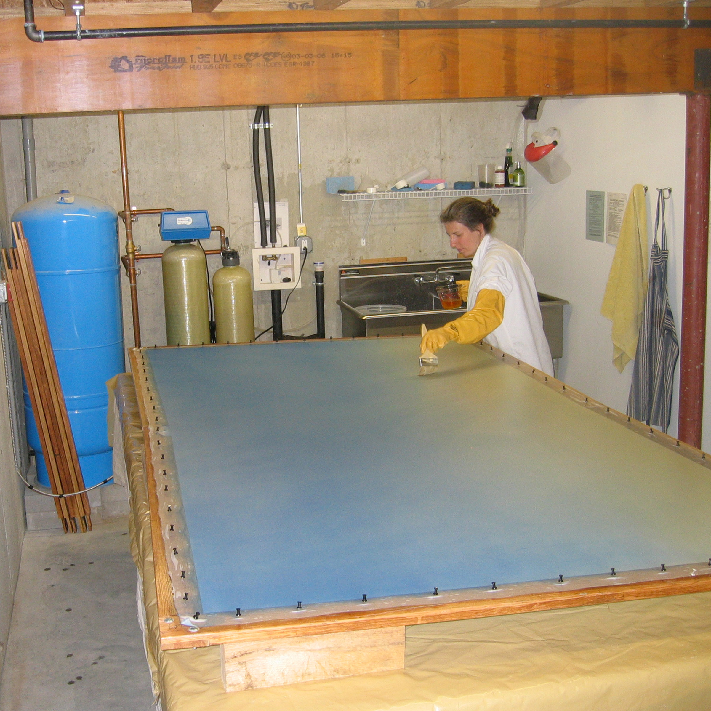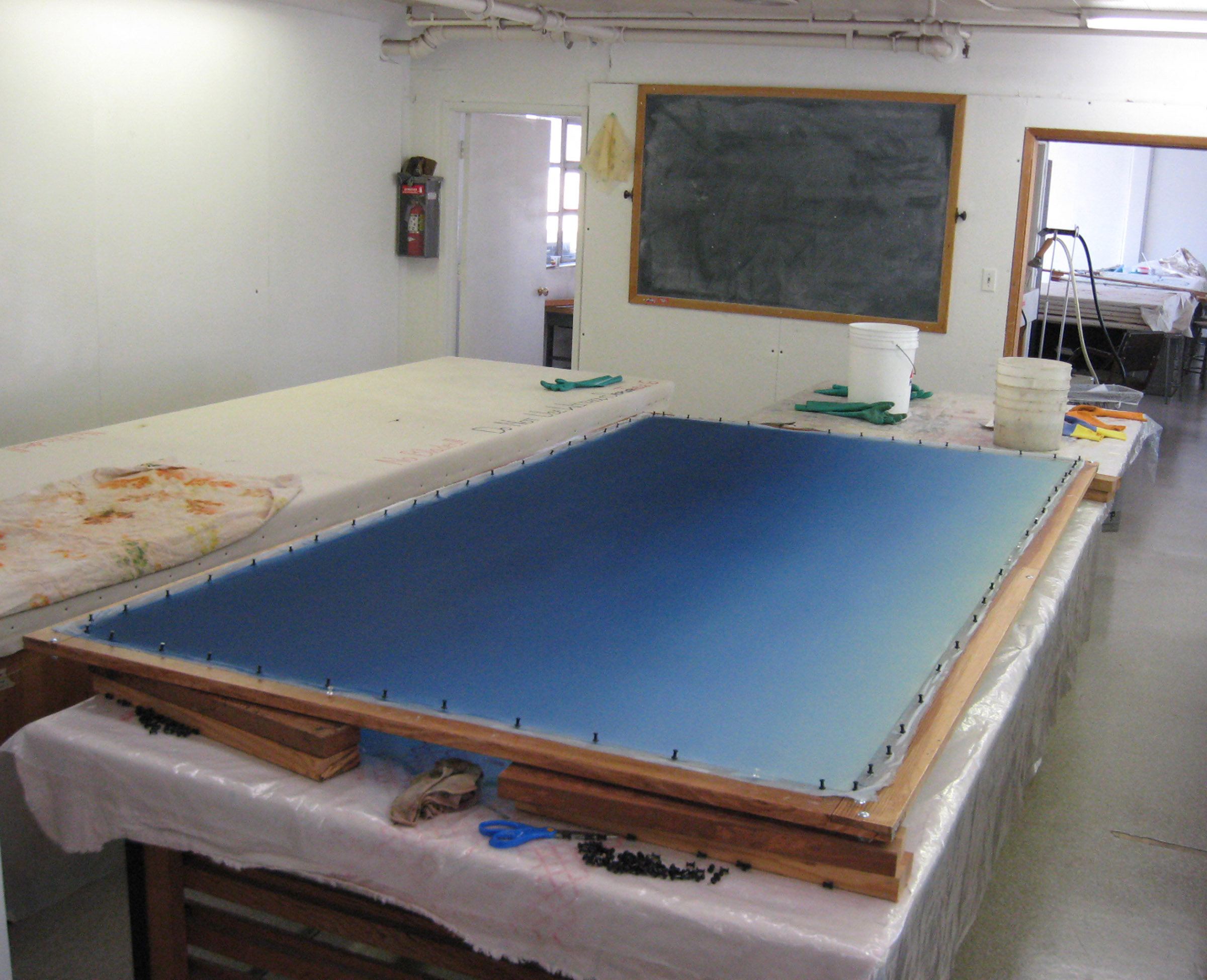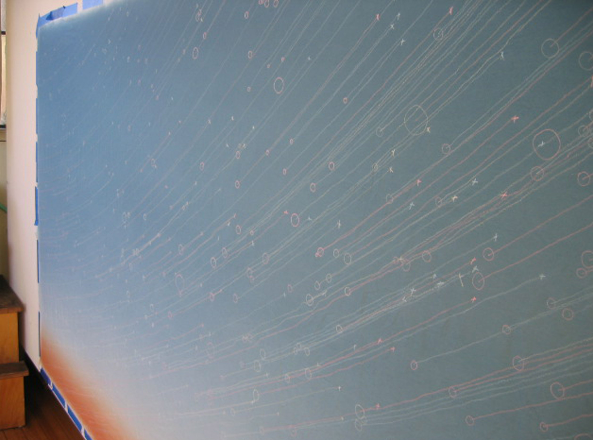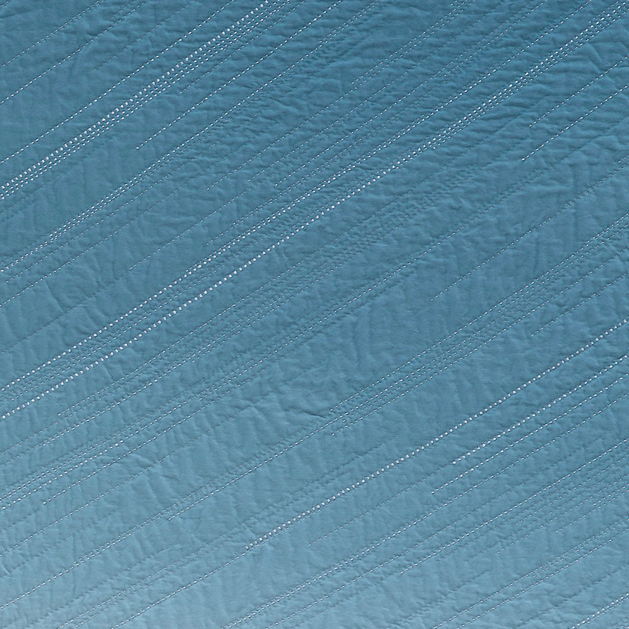 The two juxtaposed elements of light are shown in two layers: scenes at dawn and dusk are painted with dye onto fabric paired against the stitched lines of the stars fading with dawn or emerging with dusk. Here the first light of day—a harbinger of what is to come—is contrasted against the stitching of stars burning out in the sky, a symbol of what is lost.