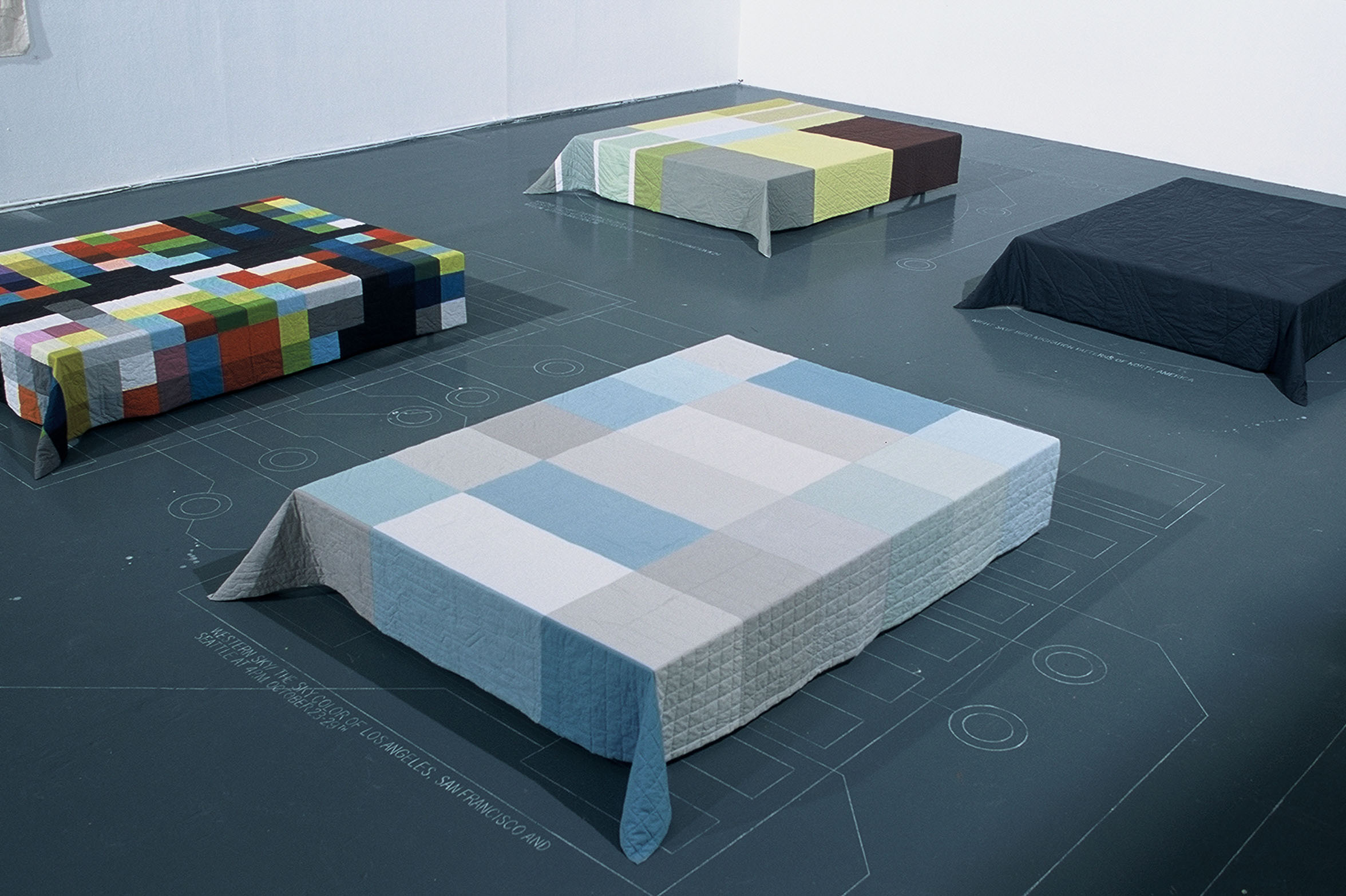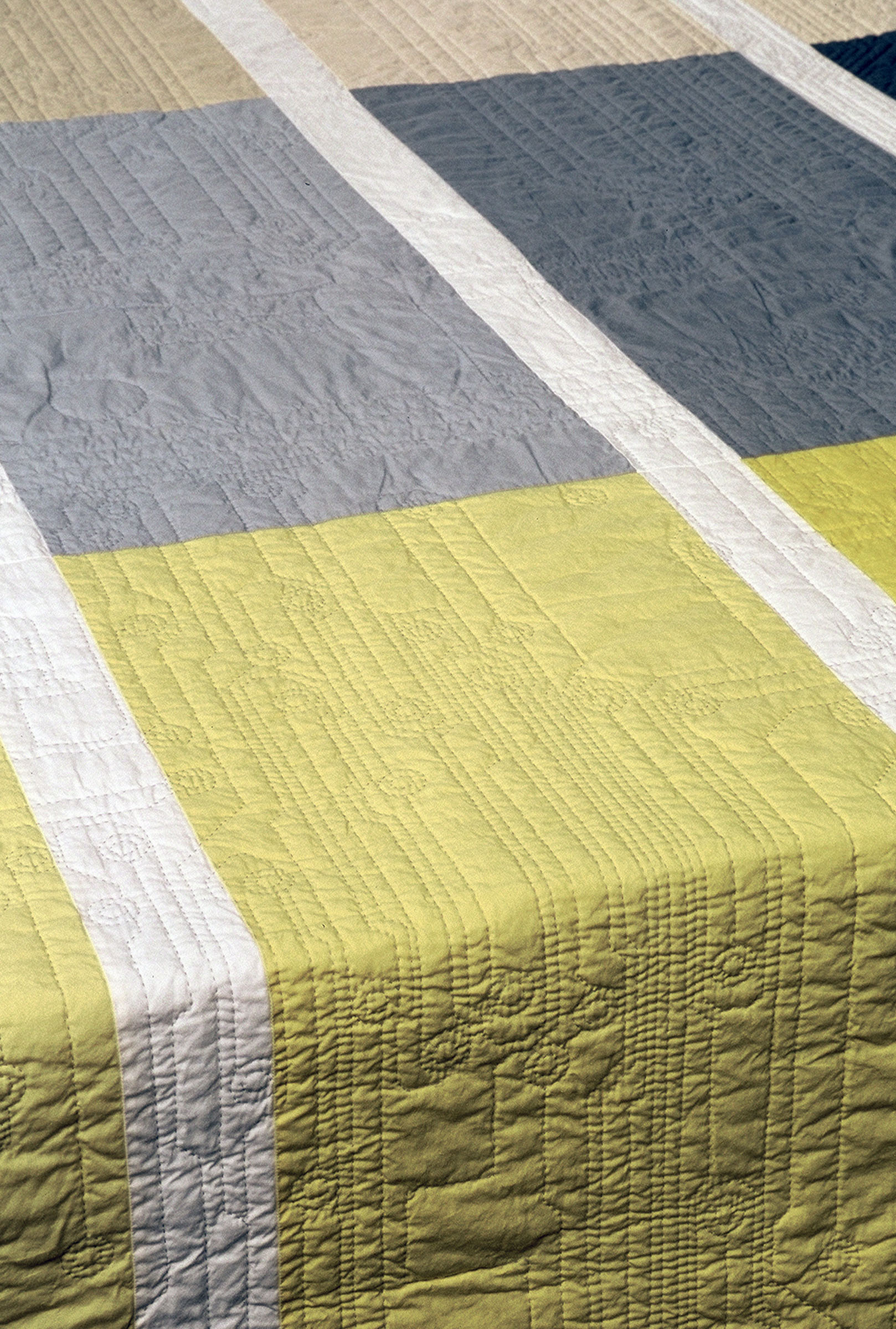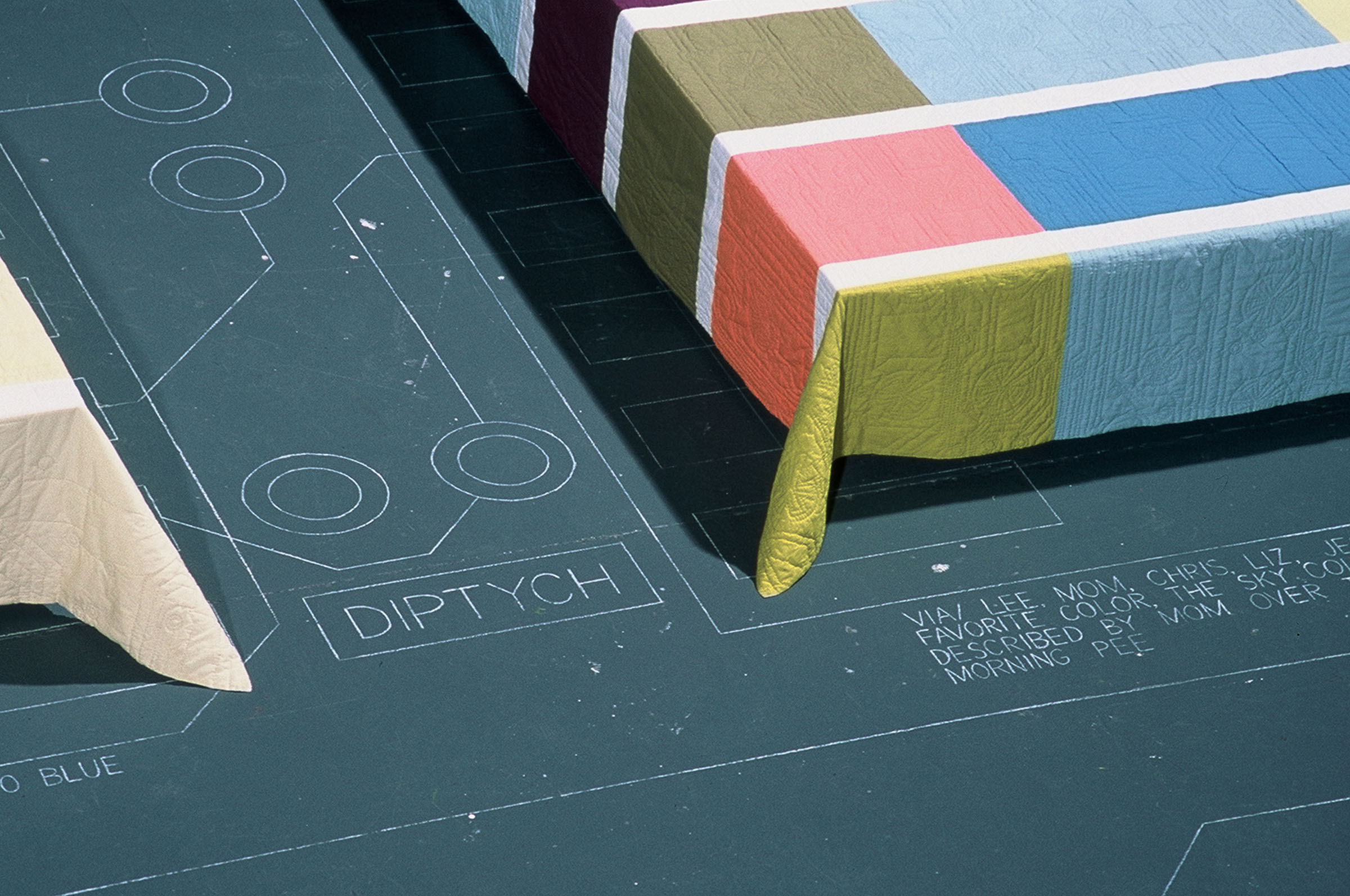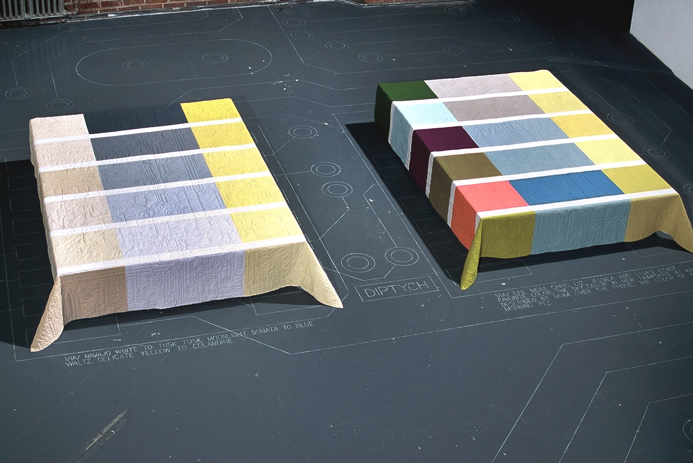 Diptych: Via/ Navajo White to Tusk Tusk, Moonlight Sonata to Blue Waltz, Delicate Yellow to Celandine, with Via/ Lee, Mom, Chris, Liz, Jessica and Lisa’s least favorite color, the New Hampshire sky color at 4 p.m. described by Mom over the phone, the color of my morning pee,2001, hand-dyed, hand-stitched cotton, 80 x 60 x 15 in.