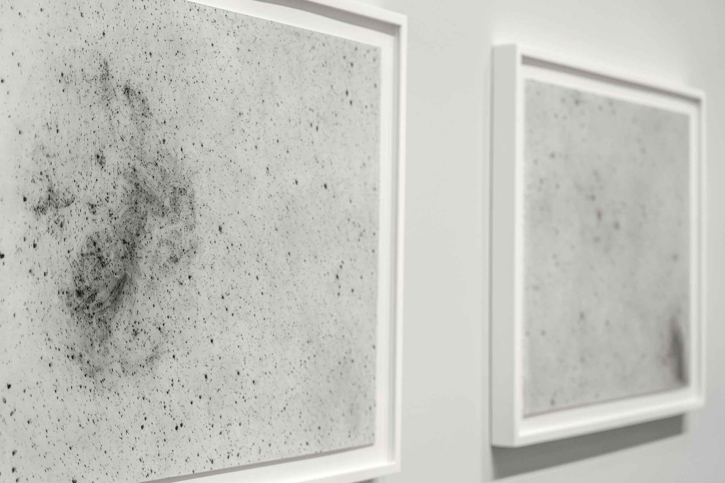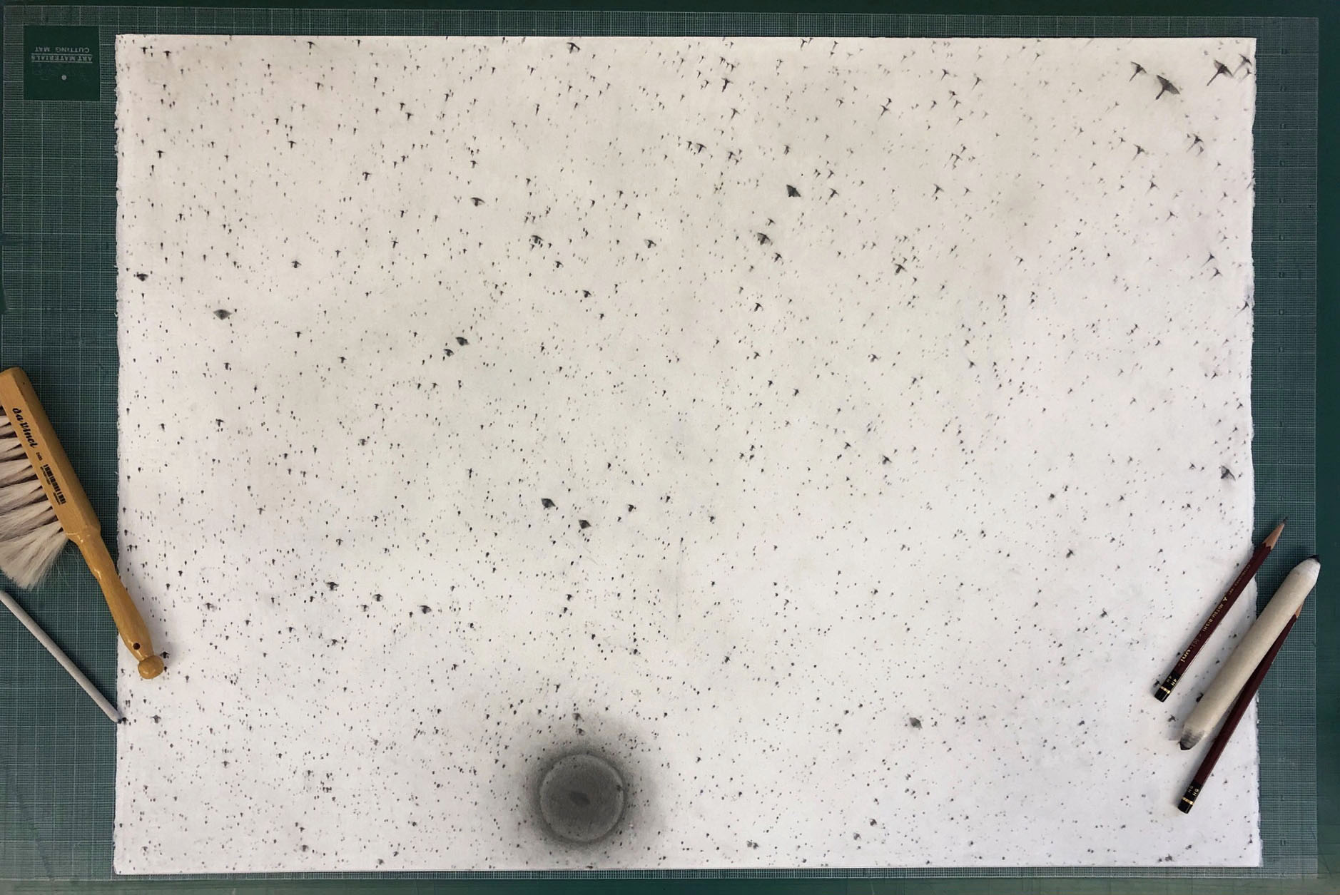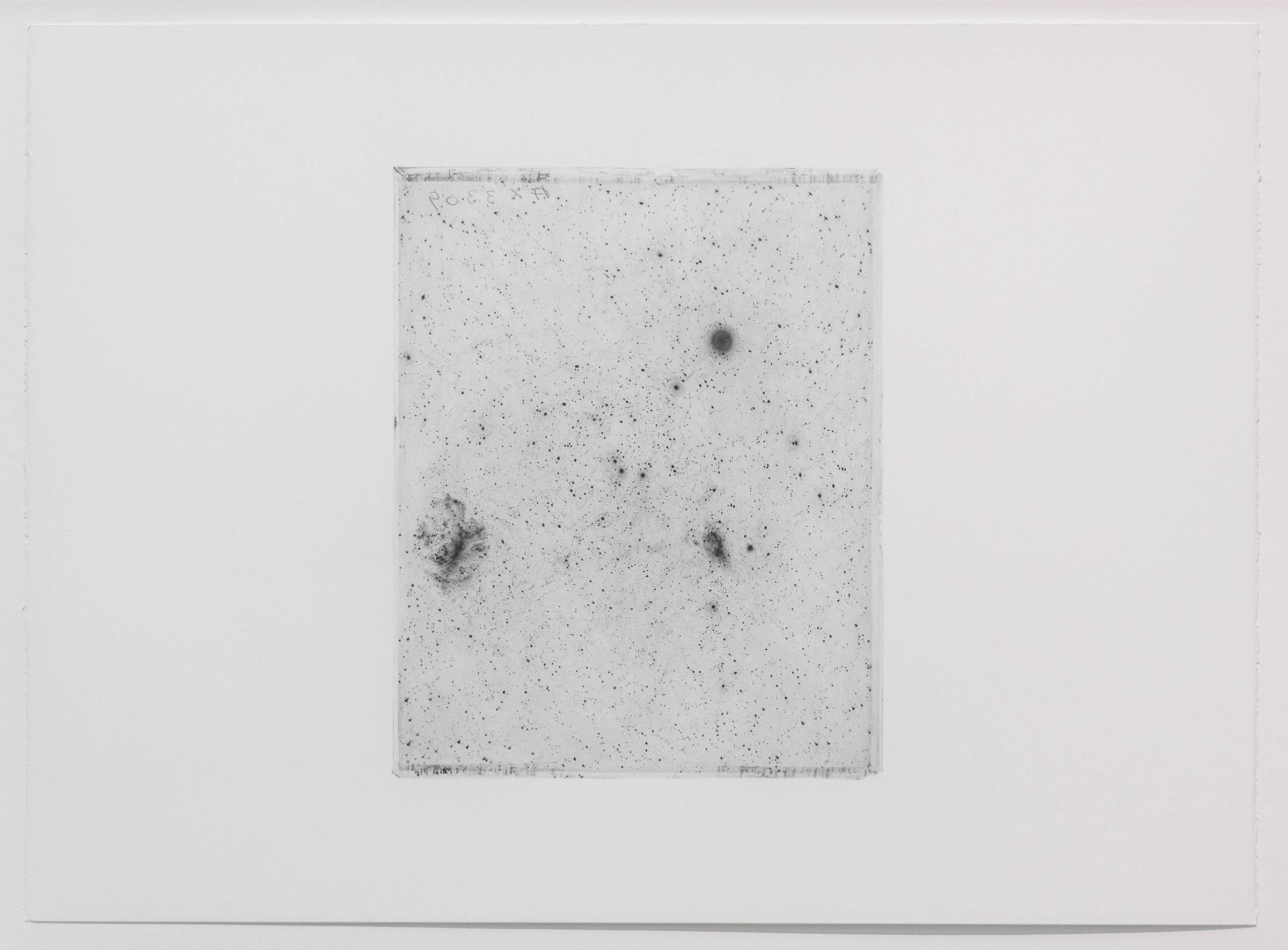 In these drawings I look at plate AX3309 that includes the Small and Large Magellanic Clouds and the bright star Achernar. This photographic negative was captured in 1934 at a time when—thanks to Henrietta Leavitt’s findings—scientists had established a way to measure the distance to stars. These objects could be imagined three-dimensionally in space. During Leavitt’s lifetime (1868-1921), this photograph remained two-dimensional, a field of black dots. Plate AX3309—encompassing the Magellanic Clouds that Leavitt studied so intensely throughout her career—for me represents this mental shift from two to three dimensions, from the unknown to the known, from one individual’s desk to the expanse of the infinite.