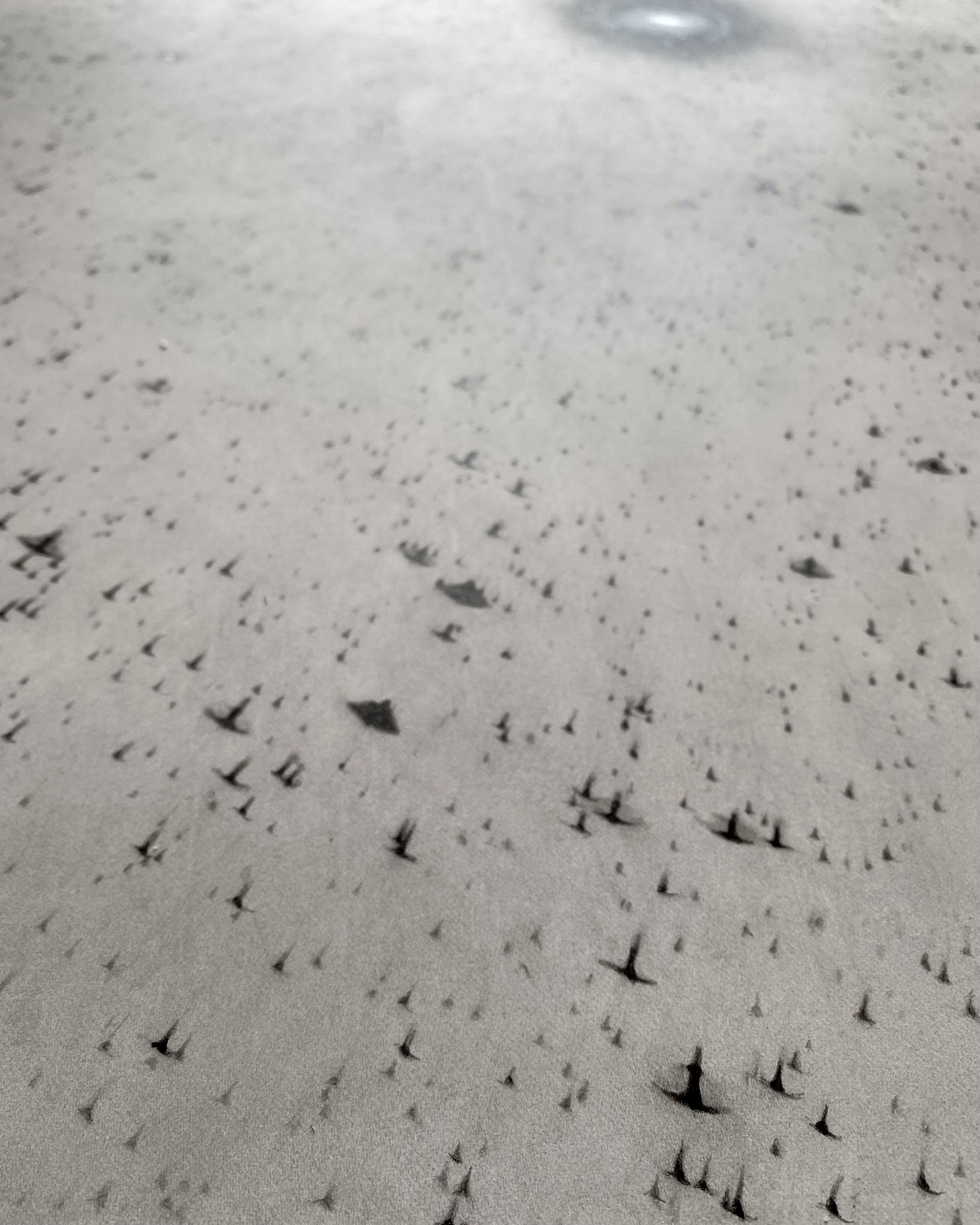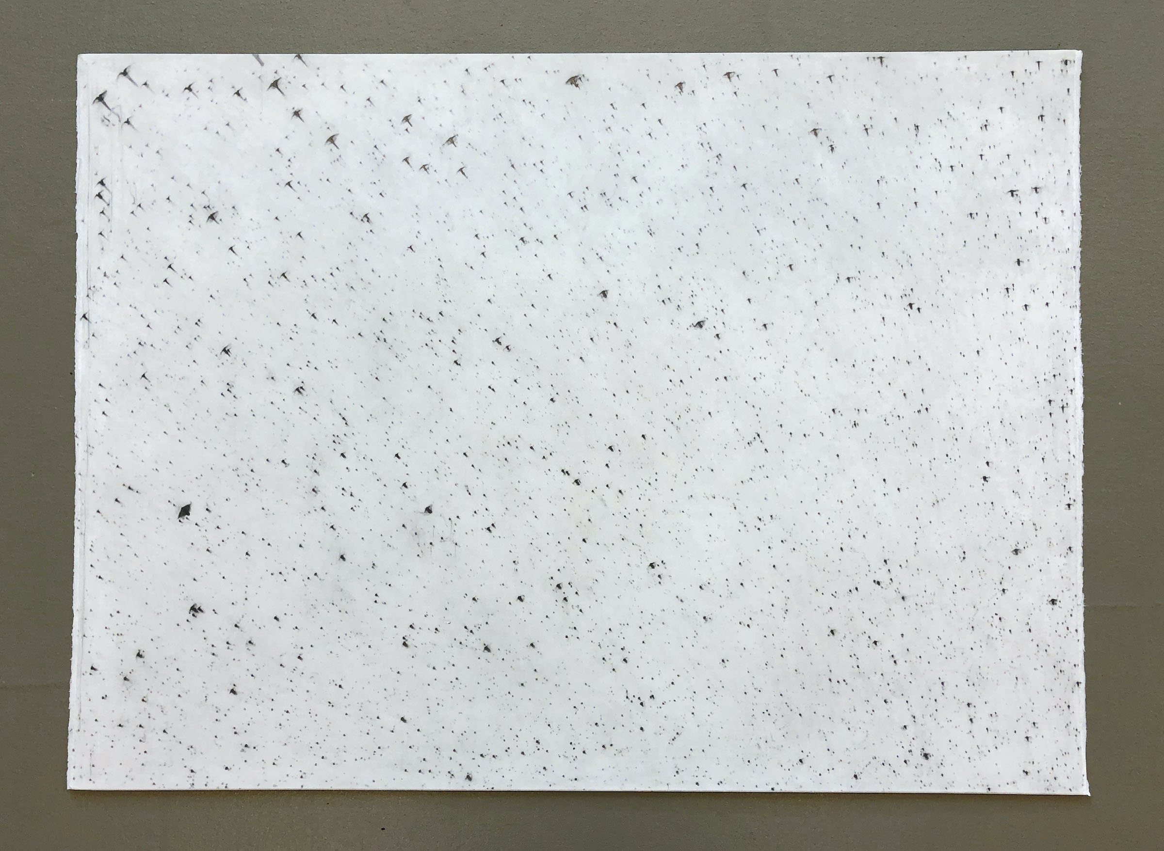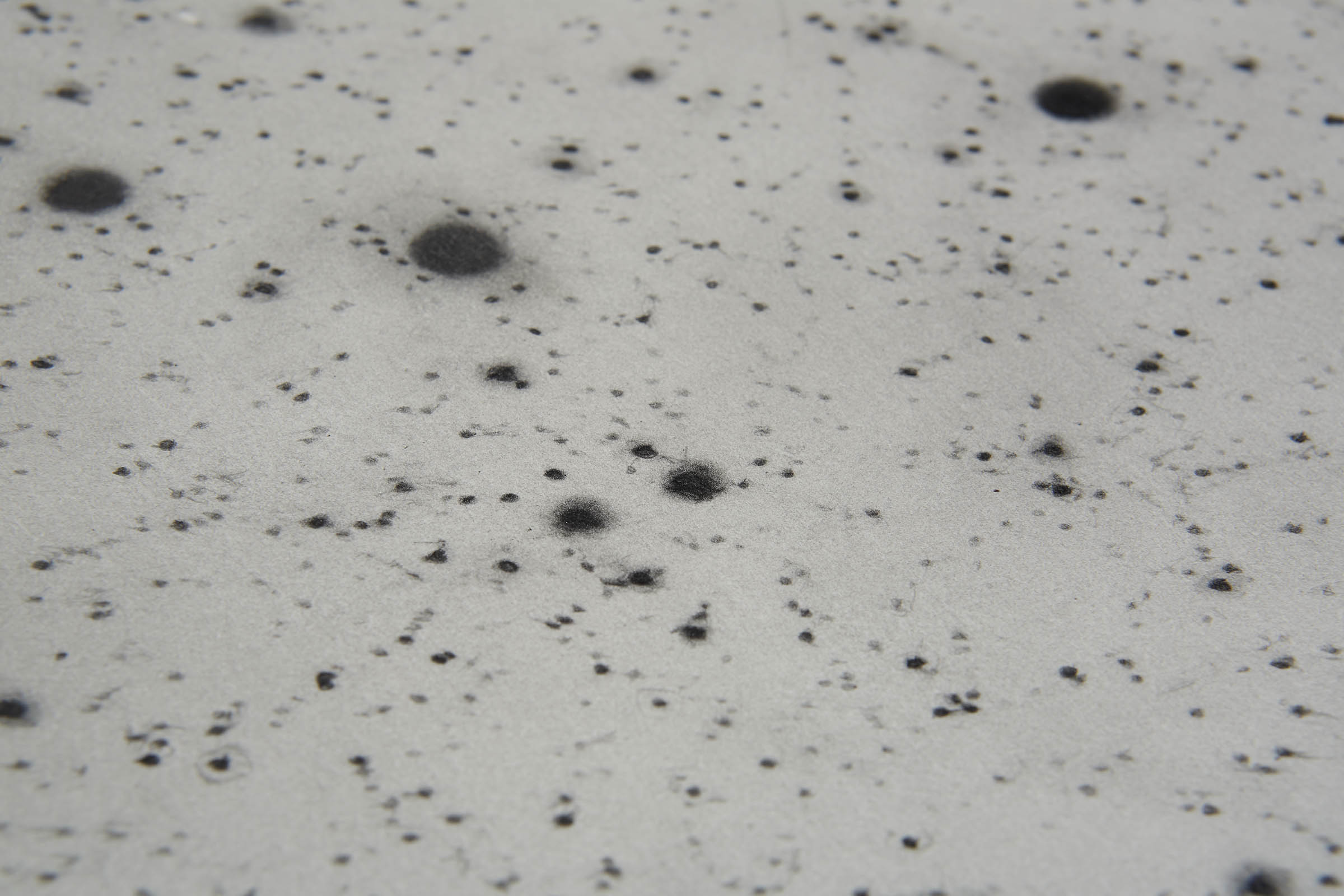 That is what first captivated me about plate AX3309. But so also did a byproduct of the technology itself: starlight hitting the emulsion was warped by the telescope’s lens, particularly at the edges of the plate, producing poetic artifacts. The specificity of each star’s shape became its own marvel. To highlight this phenomenon, after first making a drawing of the overall photographic plate, I then enlarged areas of the original plate and drew each magnified section across the entire surface of the paper.