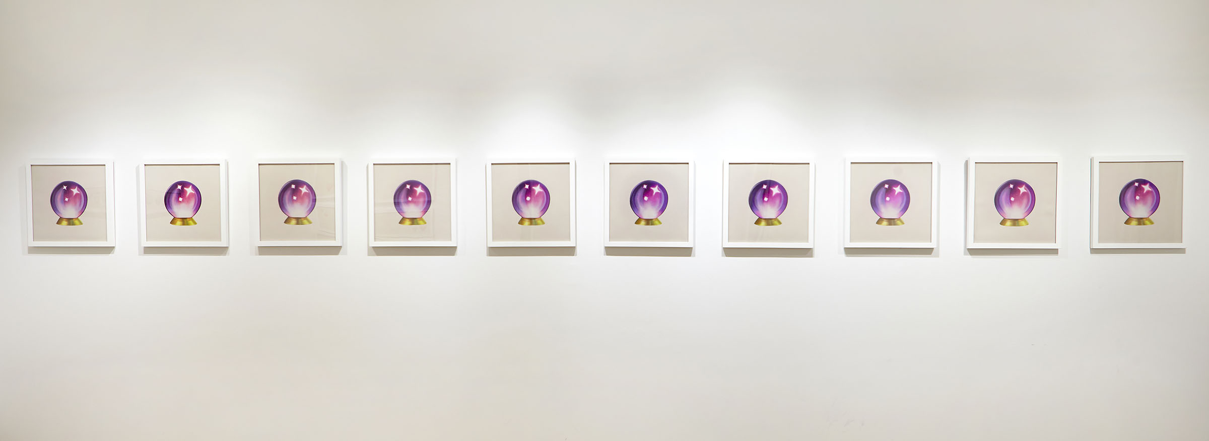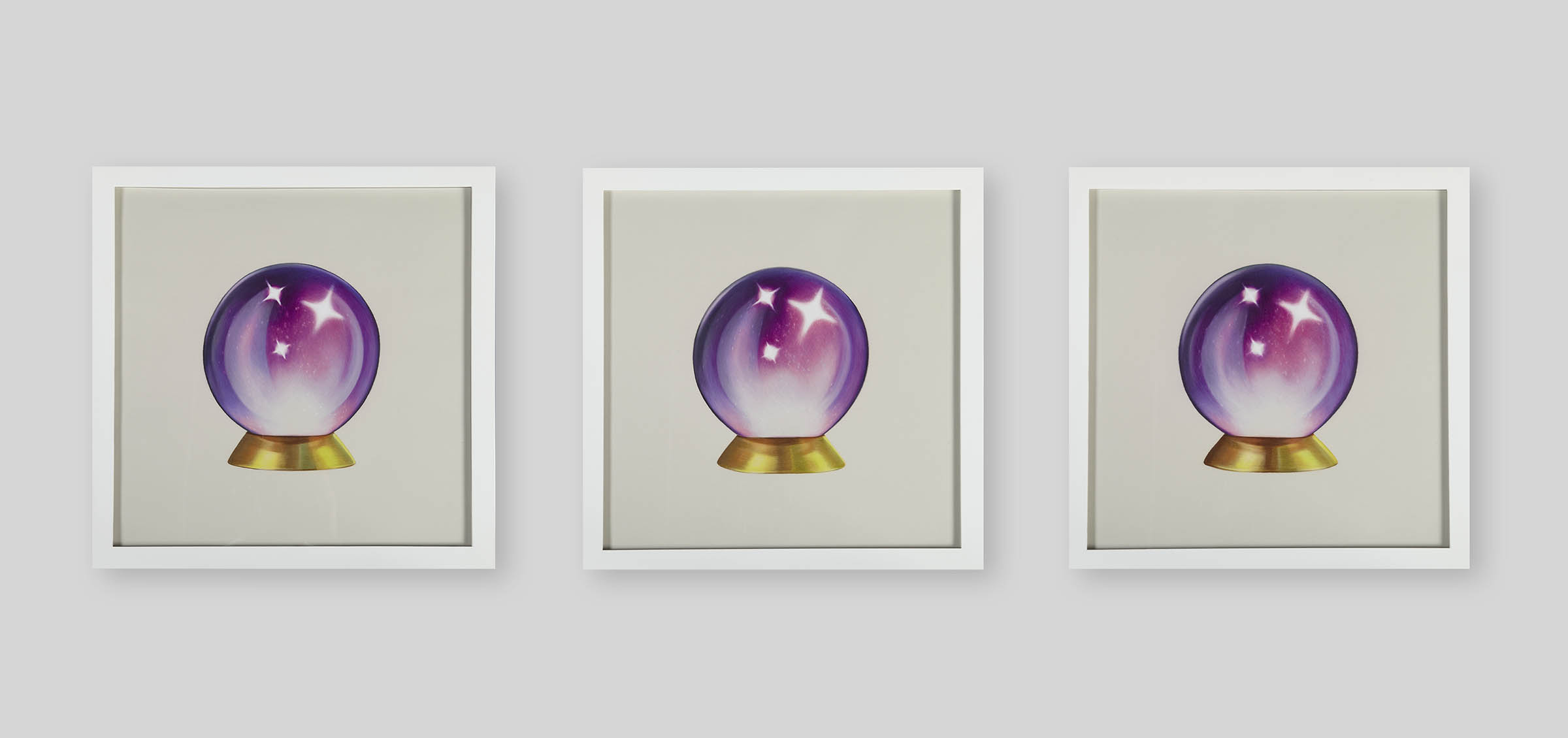 Six crystal ball drawings, part of a larger series, are included in the exhibition. Choosing the crystal ball as a symbol implies a search for meaning, seeking insight into an uncertain future. It also investigates the present. Drawing the same object over and over again asks the question: Am I paying attention? In my studio practice, I interspersed my repeated drawing of the crystal ball emoji among other projects. Each time I sat at my desk to begin a new crystal ball drawing, I was surprised how excited I was. It was not an exercise in tedium; it was one of discovery.