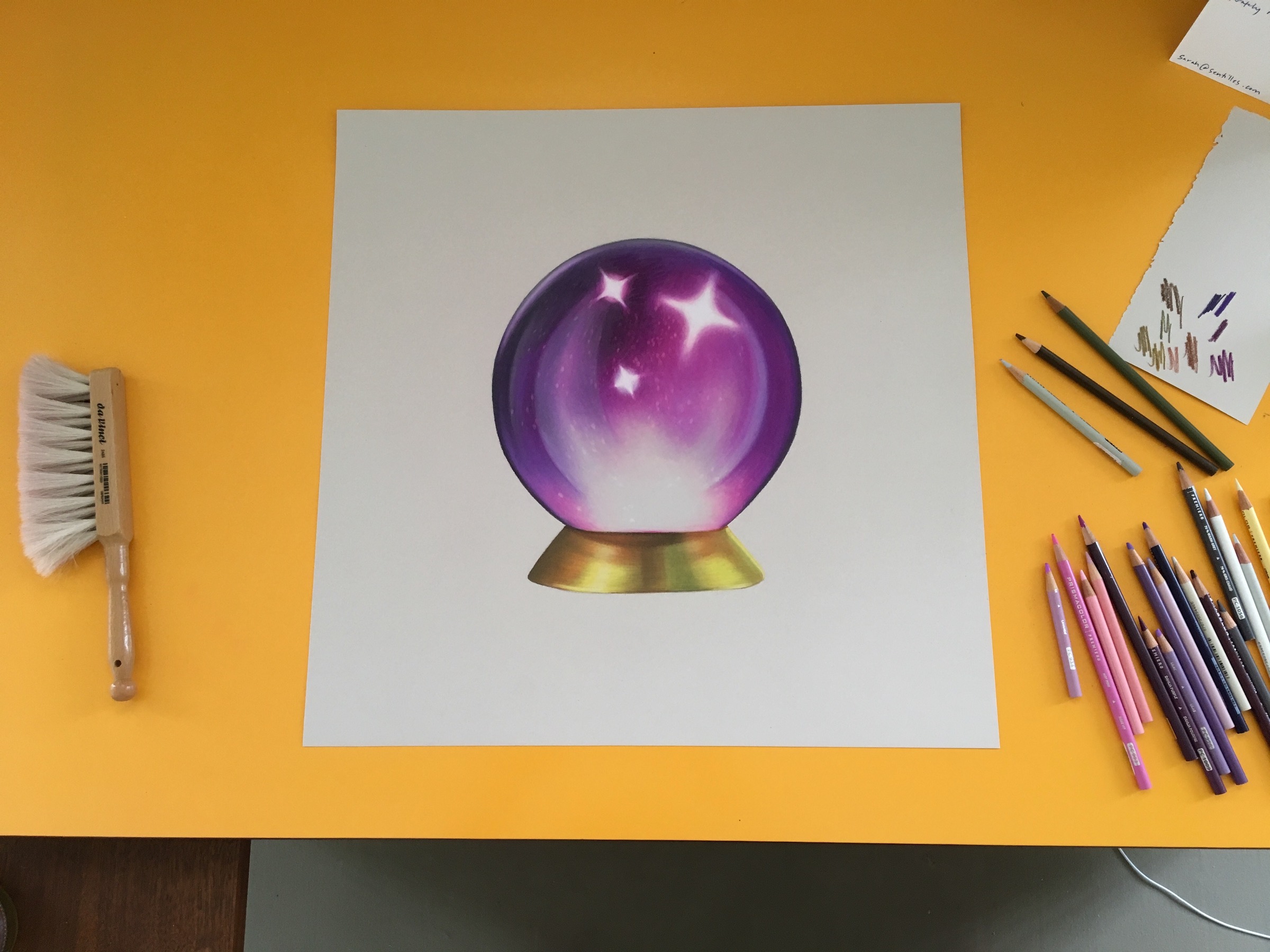 I then build the color in layers. The wax binder keeps the pigment suspended, allowing me to blend new colors into ones I’ve already put down. It feels like mixing paint right upon the paper’s surface. Some colors are very forgiving, letting me push the color around until I’ve got it right. Other pencils, like the cursed greens, are harder, truly: they contain less wax and therefore aren’t as friendly to work with.