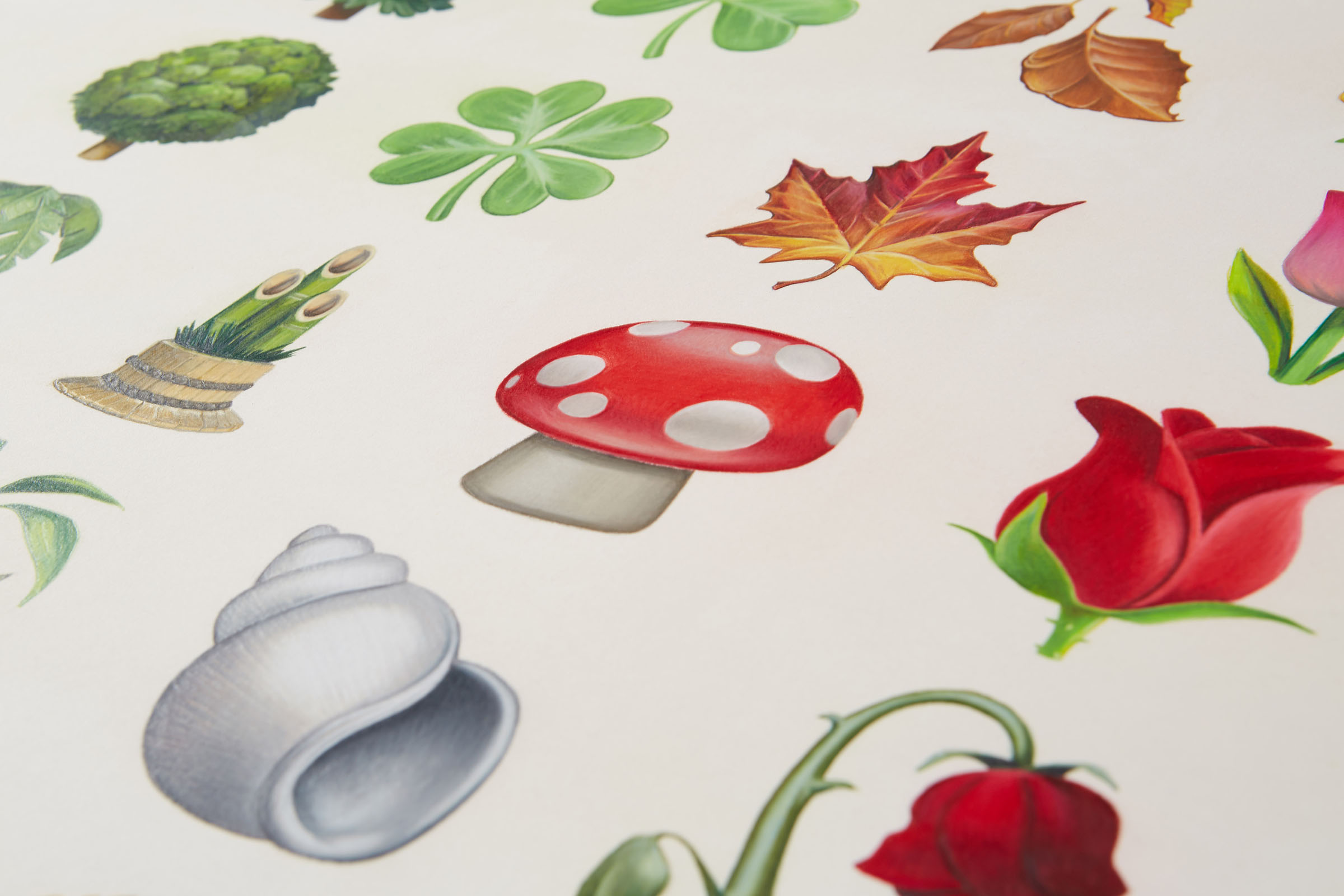 In the drawing Nature I depict all of the emojis in the category Nature, which can be read as a one-liner about our paltry relationship with the natural world in our digital age. But this group of emojis is also evidence of how, in our rituals and traditions, elements of nature are original sources for meaning: the evergreen tree as a symbol of resilience during the darkest time of the year, or the bamboo shoot welcoming growth and happiness in the Japanese New Year. The line between ourselves and nature can be a useful one, preserving wildlife and wild spaces. But that situates us outside of nature. We have constructed that boundary. Nature occurs around us, within us, and by us. Our phones are part of this ecosystem.