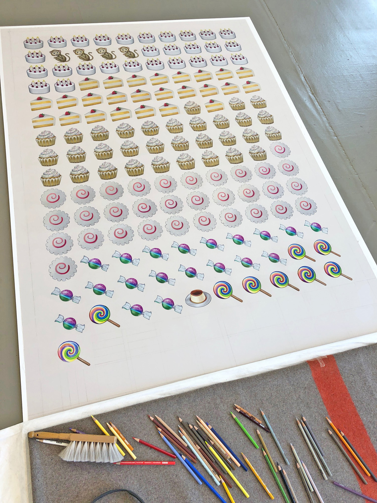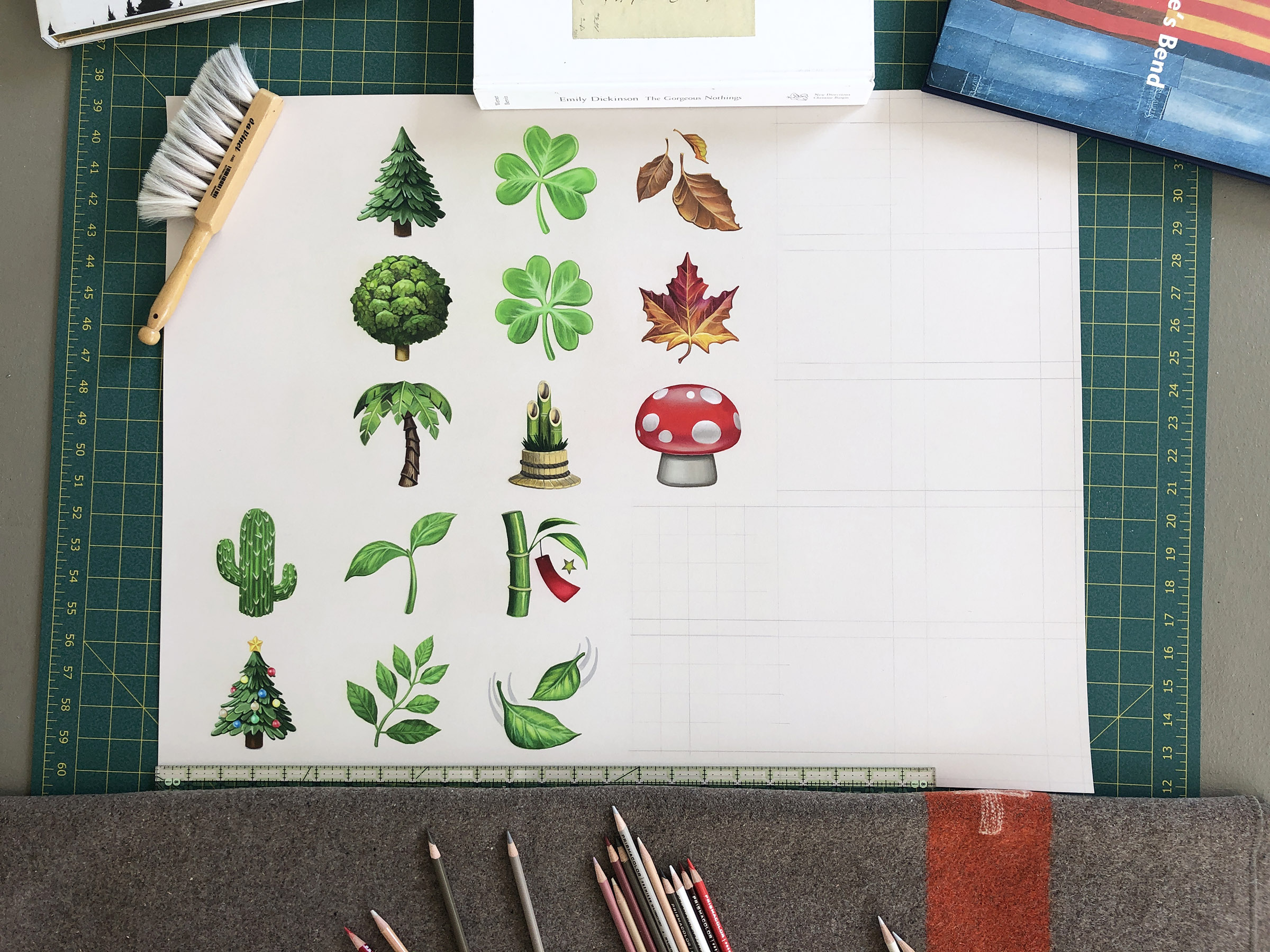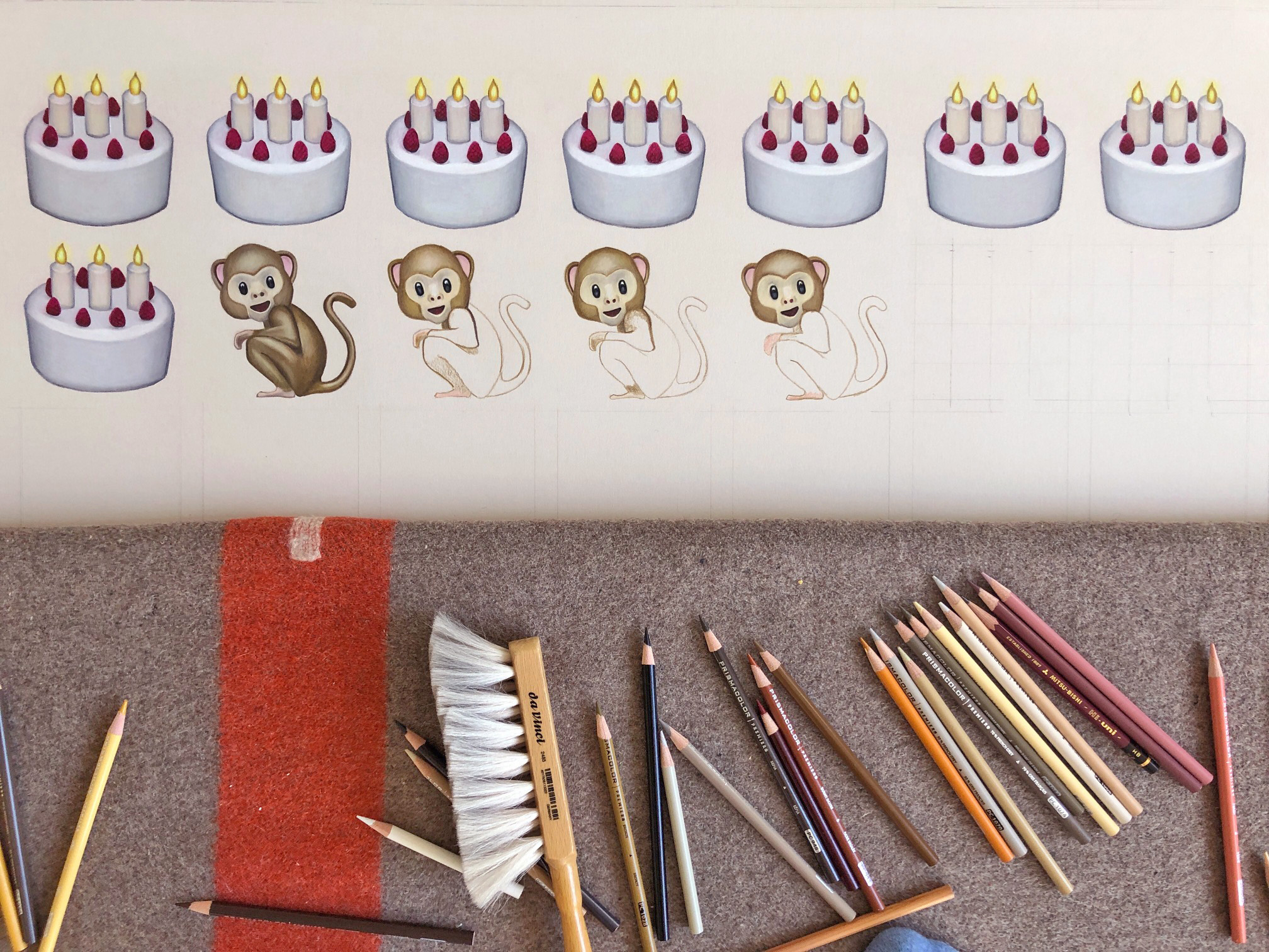 For each symbol, I start with an enlarged version of the emoji on my computer screen, sketching what I see in graphite. As soon as I feel like I’ve gotten the proportions right, somewhat absurdly I erase my marks until just a ghost remains. Otherwise the colored pencils would get smudged by the lead.