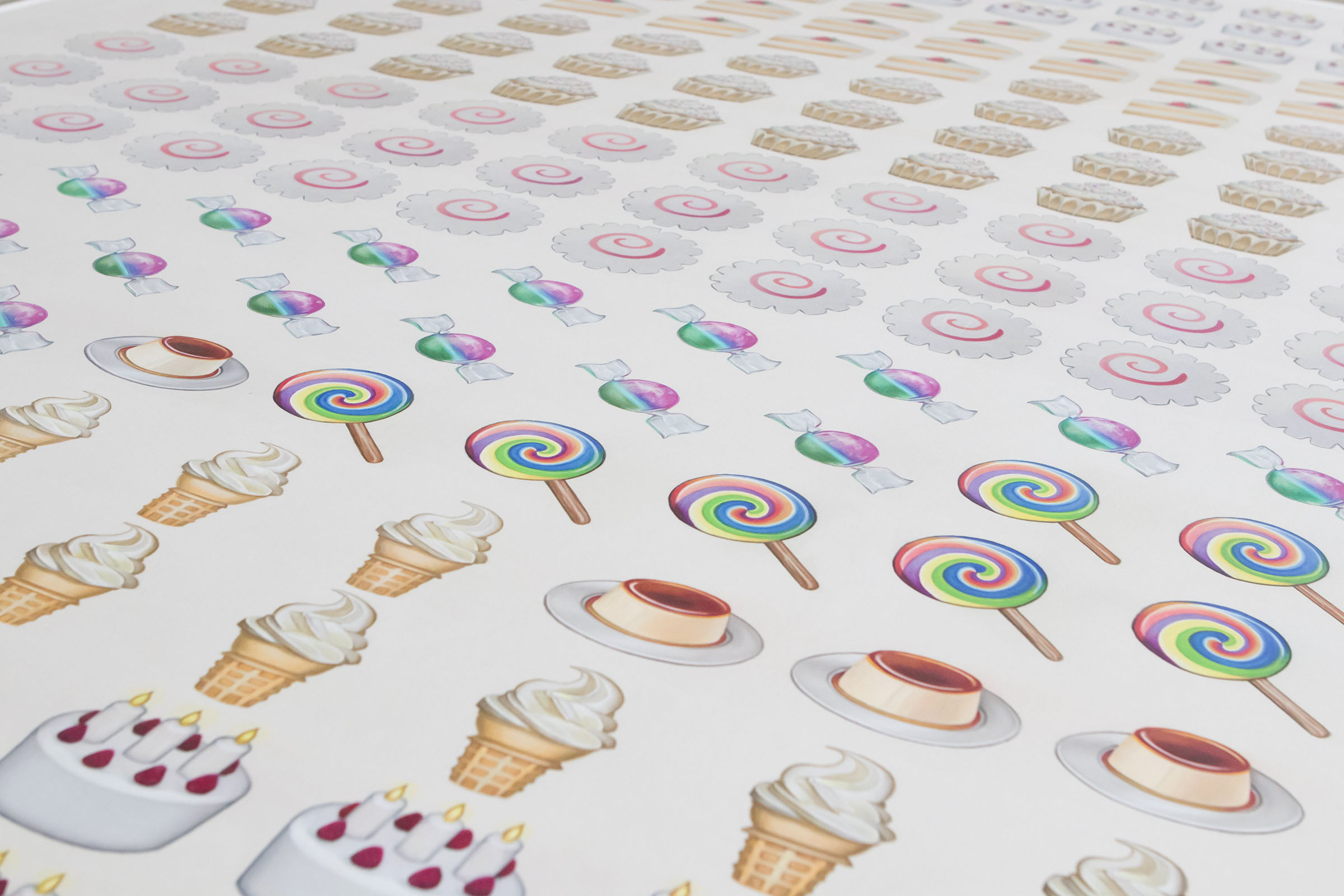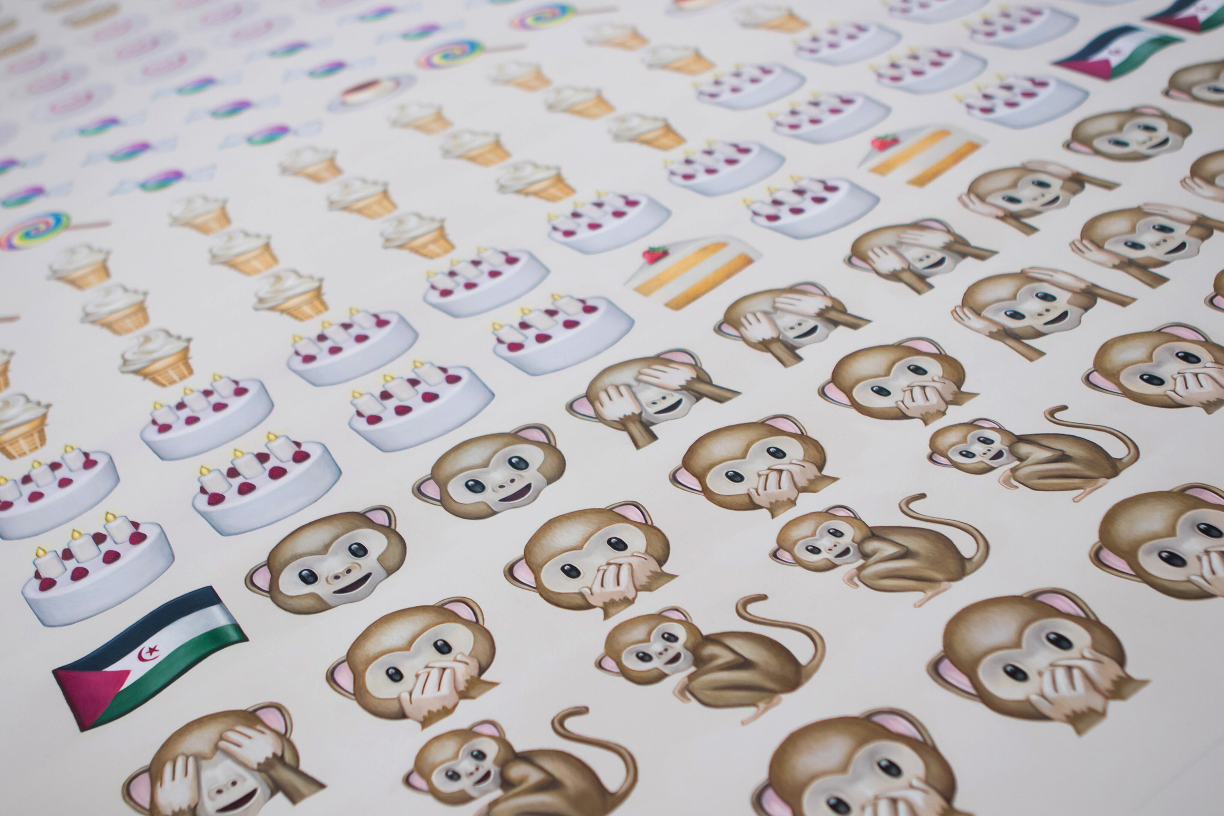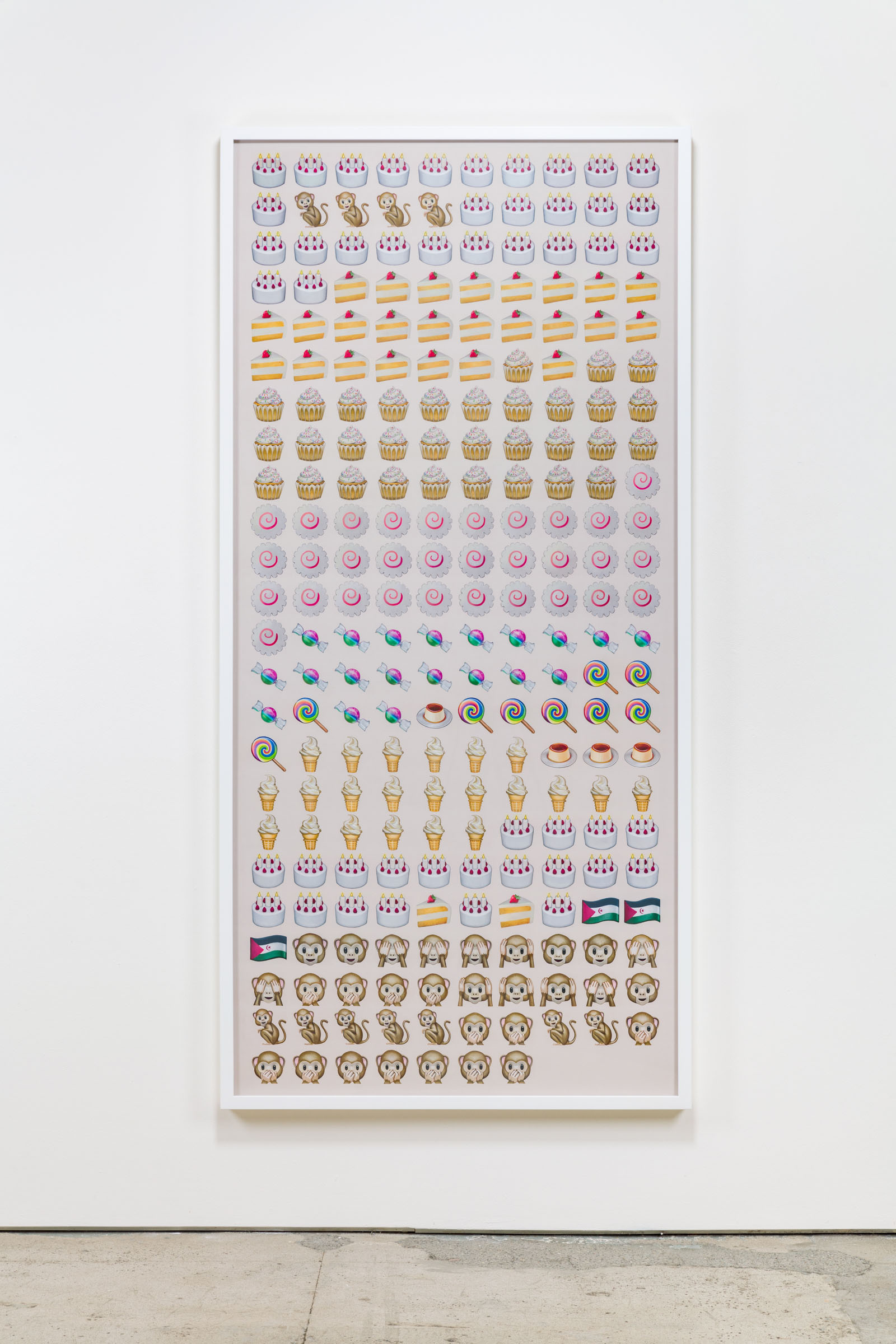 The largest drawing in the exhibition, Whoh (J.J.’s text to her mom from her father’s phone, Sept 4, 2019), is based on a text sent by a five-year-old to her mom about her love of sugar. Translated into an eight-foot tall drawing, the drawing becomes an operatic score of desire, conviction, addiction, and excess. The monkey is a protagonist in this narrative, introducing mischief, morality, and empathy. After row upon row of sugary treats, three Western Sahara flags are a surprising inclusion, especially considering how far you have to scroll to get to flag emojis from cupcakes. (When asked to clarify, J.J. said her stuffed animal did it.) Well, everything is political. The last row of speak-no-evil monkeys I see as vacillating between horrified surprise, complicit silence, and suppressed giggles. It is a musical composition replete with held notes and motifs, a reprise of the monkeys after an interlude of flan and rainbow lollipops. Seen as a literary text, my drawing becomes a close reading.