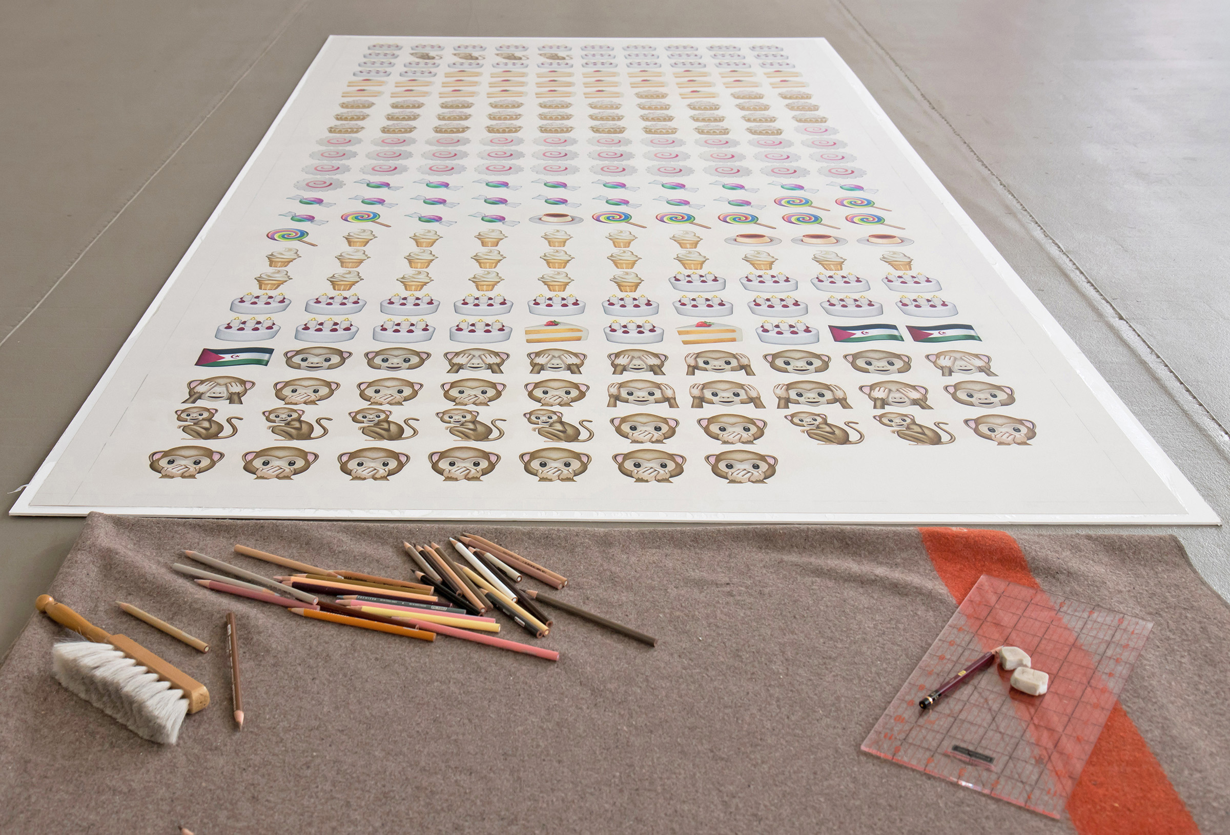 I make each drawing the way each original text was composed: emoji by emoji, row by row. Forecasting into the future doesn’t help—I might know I have 113 more emojis to draw, but that’s not a very useful thing to dwell on; the past is not a visual reference point—I literally cover it up with a sheet of paper to protect what I have already drawn. Which leaves me suspended in the present. Which, of course, is where we always are, despite our routines. The construction of this drawing is a continuous reengagement with that fact.