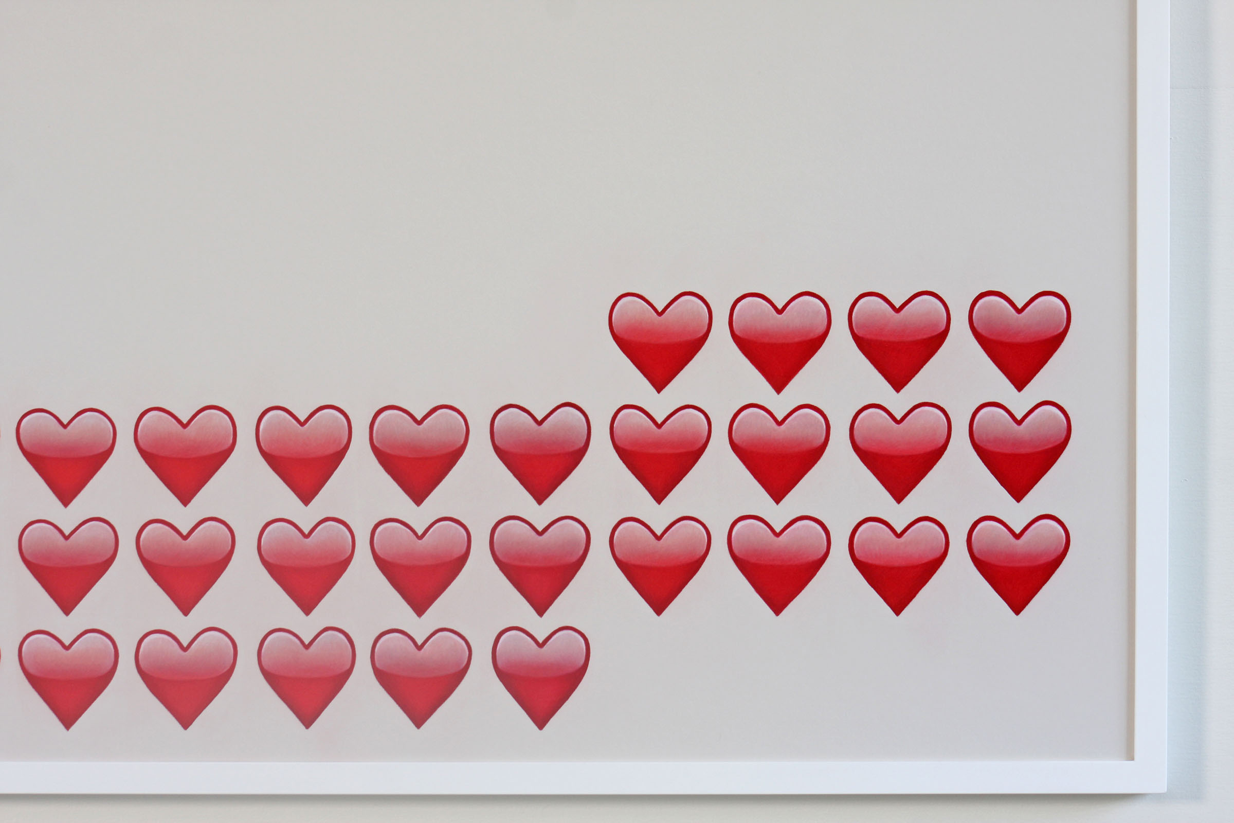 For another work in the exhibition, Every text from Joy that includes an emoji (Jun 18, 2016), I keep the proportions of my friend’s original text the same, but substitute blank paper in place of words, drawing only the thirty red hearts that conclude her message. The drawing uses the language of minimalism, yet one steeped in intimacy. It becomes literally heart-centered, a meditation on the small and large gestures that build a friendship.