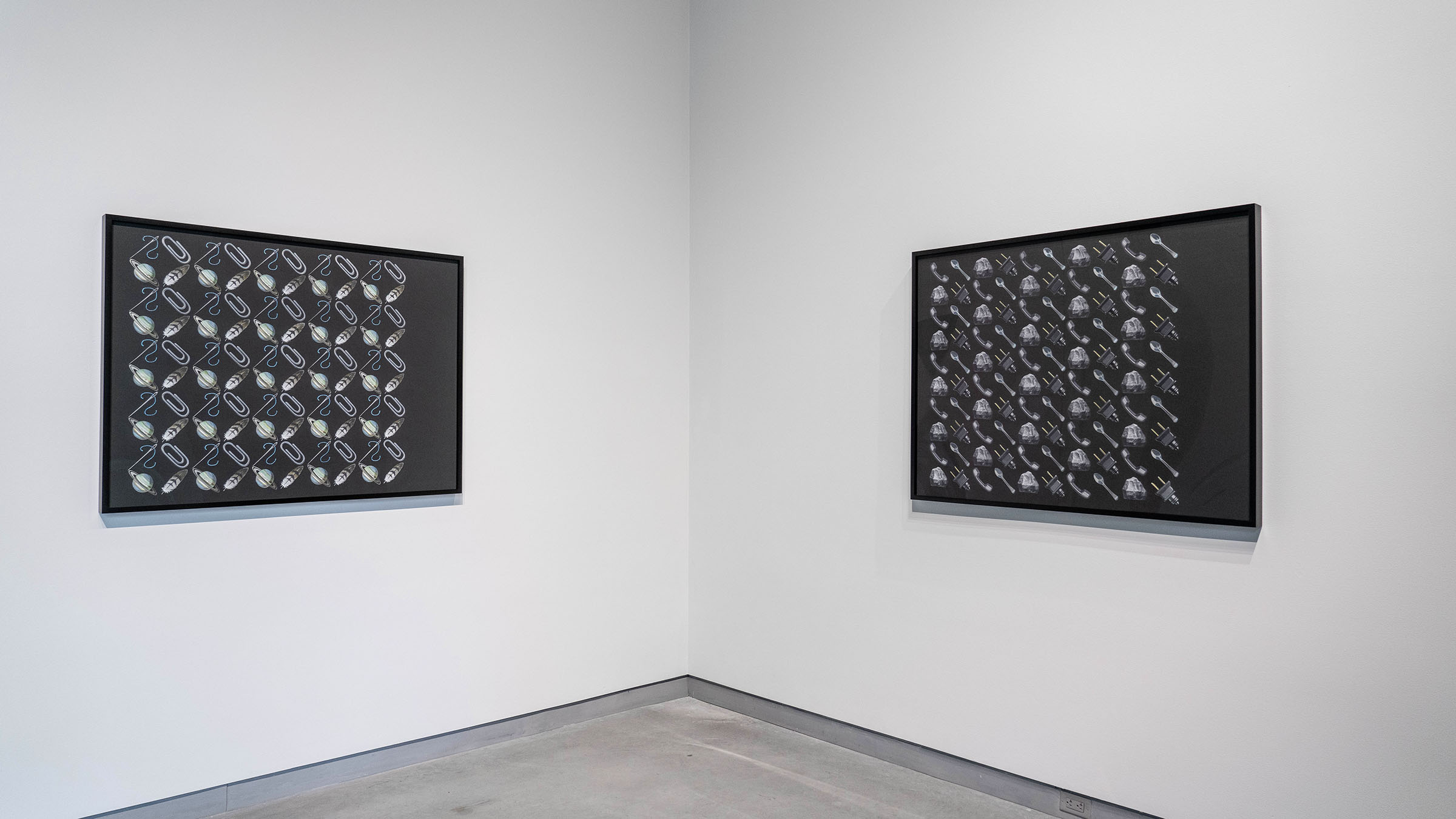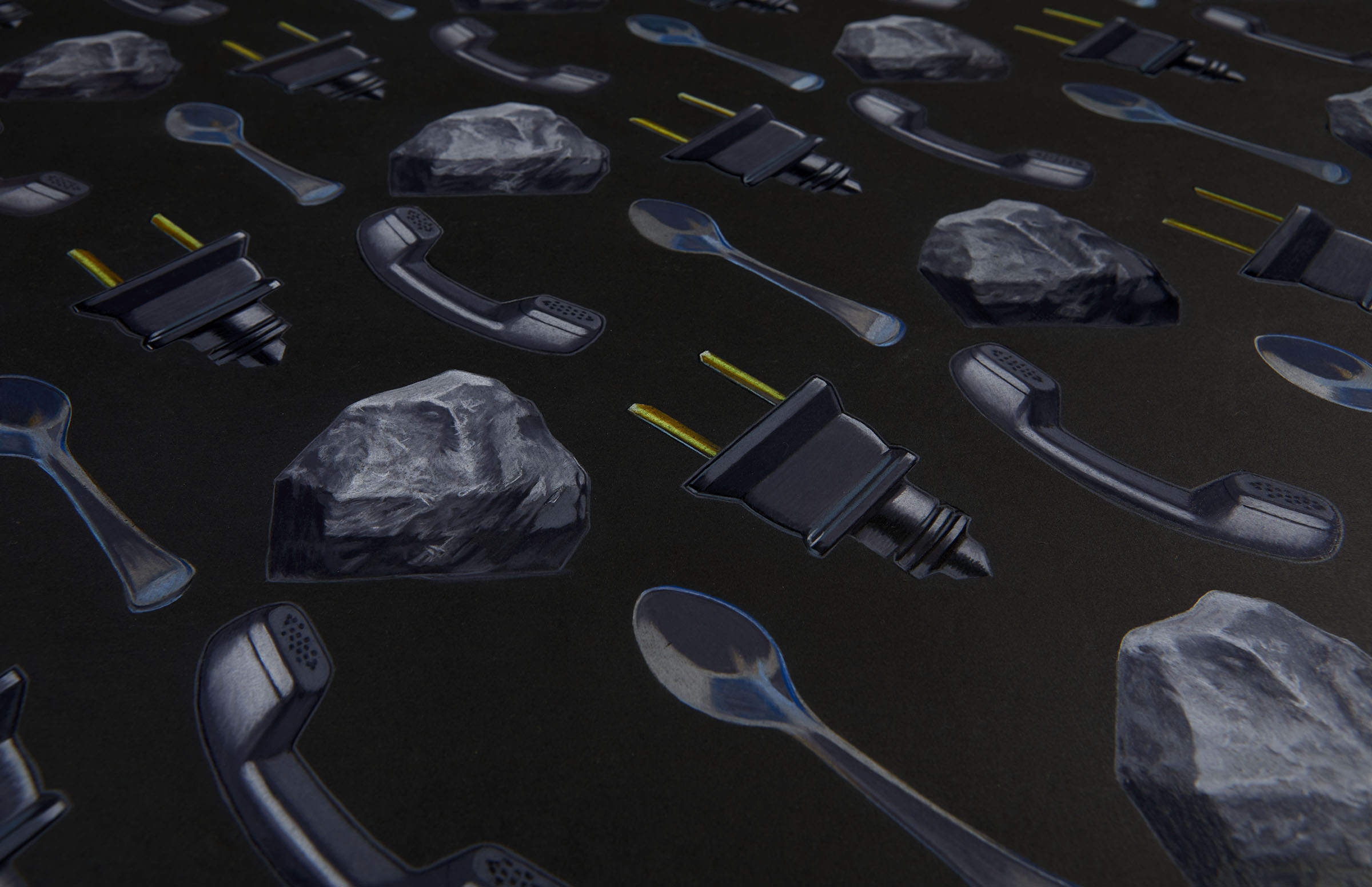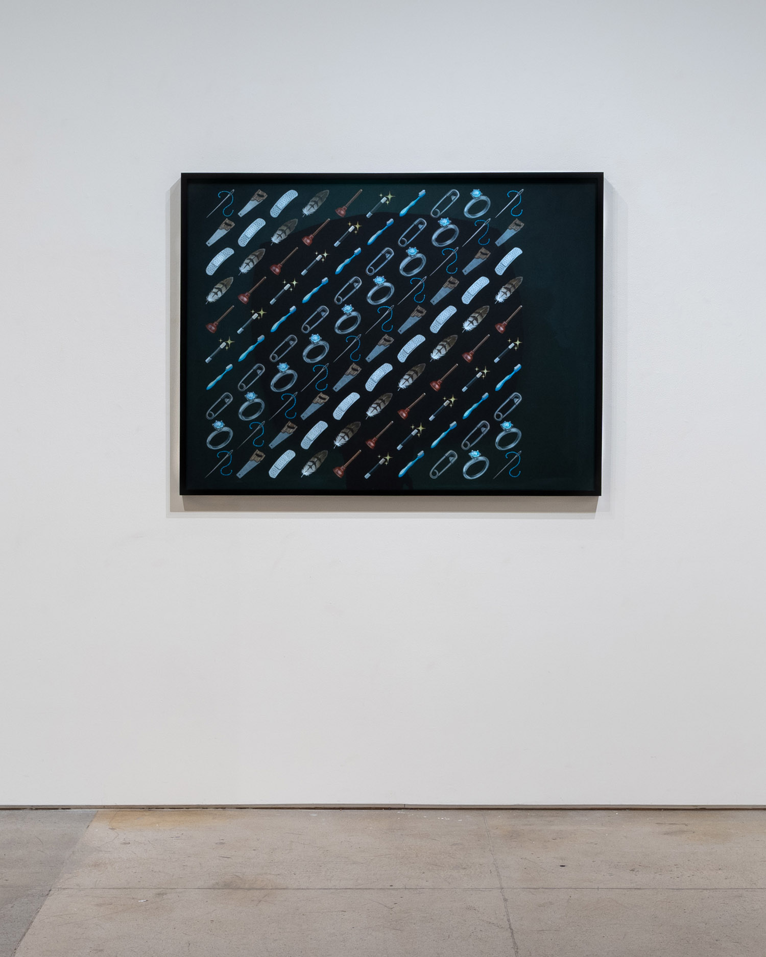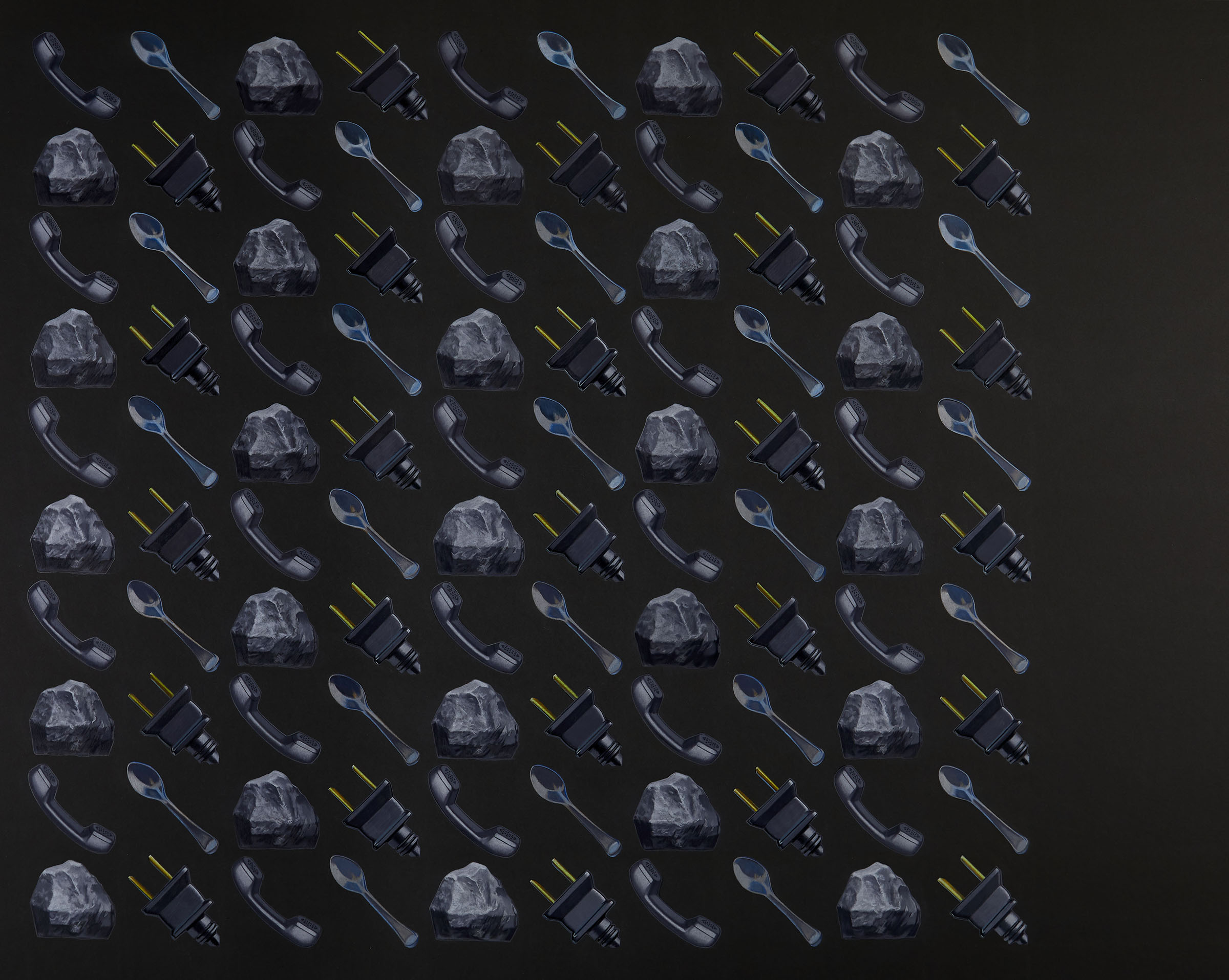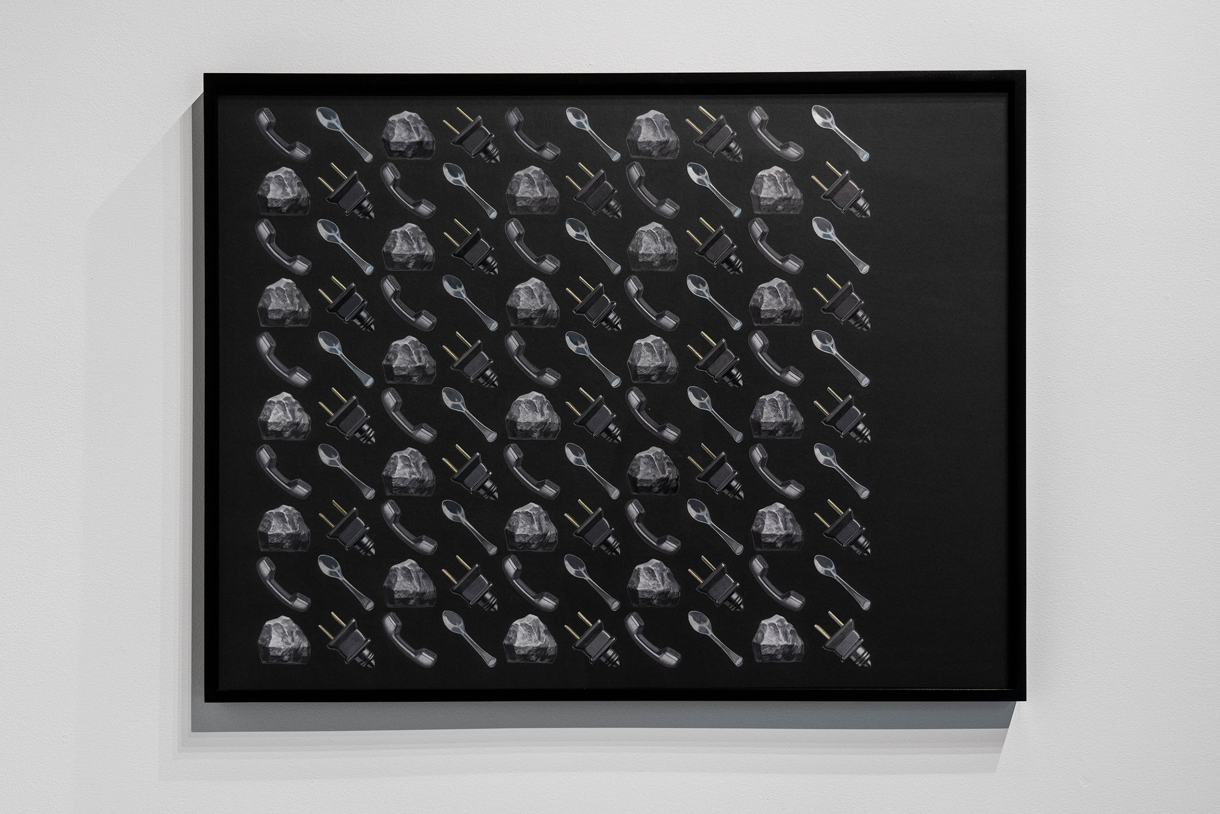 Each of the three drawings in this series uses pattern to animate the symbols that populate our phones. In one drawing, items of mending, tending, cutting, and repairing—and a little magic—repeat in a diagonal cascade, their replication a simultaneous assertion of presence and meaninglessness. In another, the slanted shapes of four emojis are arranged and repeated to evoke the traditional Tumbling Blocks quilt pattern. In a third drawing, the sheen on plastic and metallic surfaces pulls shapes from the black background; their materiality speaks to the elemental nature of all things: minerals that constitute rocks, copper that carries current, spoons that deliver nutrients to our stomachs, phone receivers that bring sound waves to our ear.
