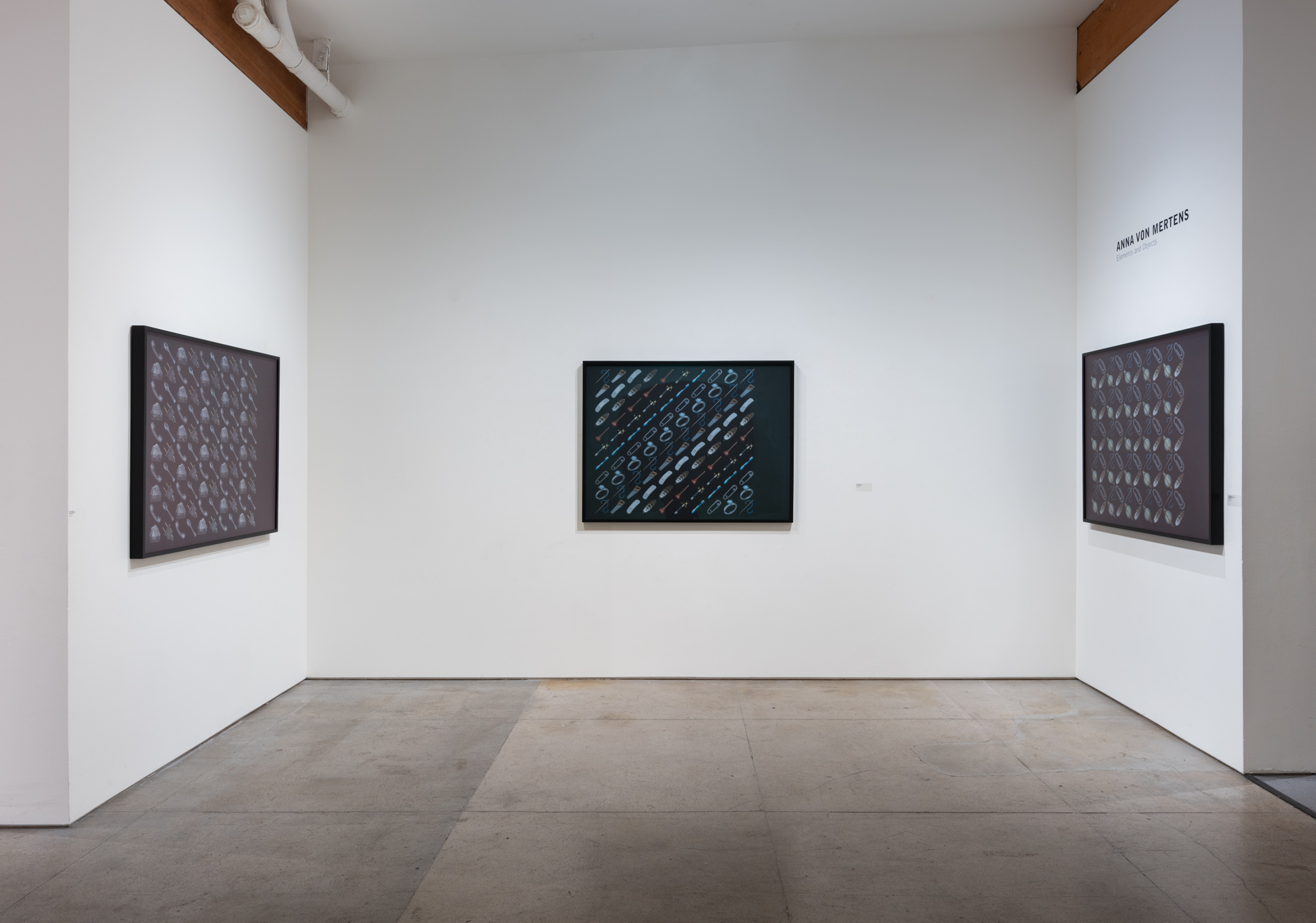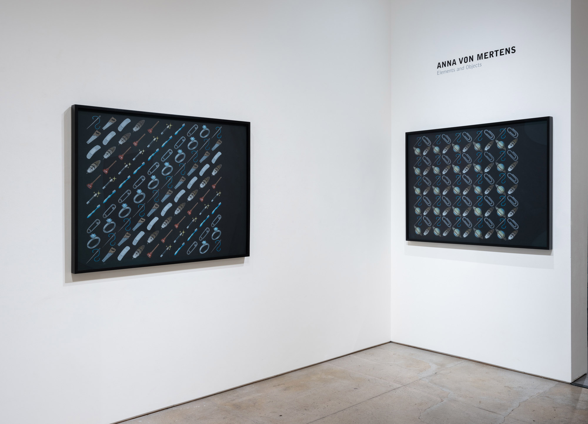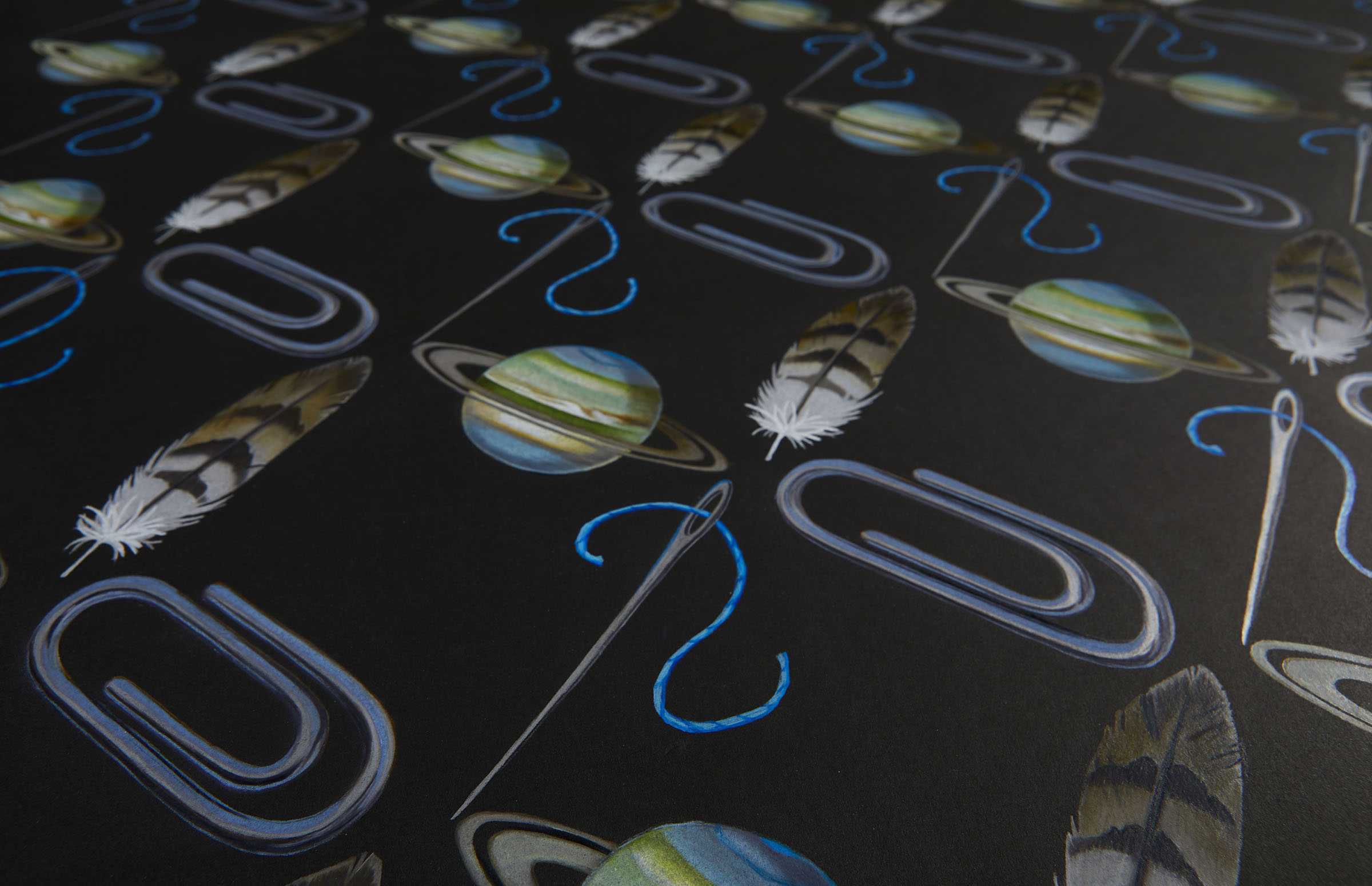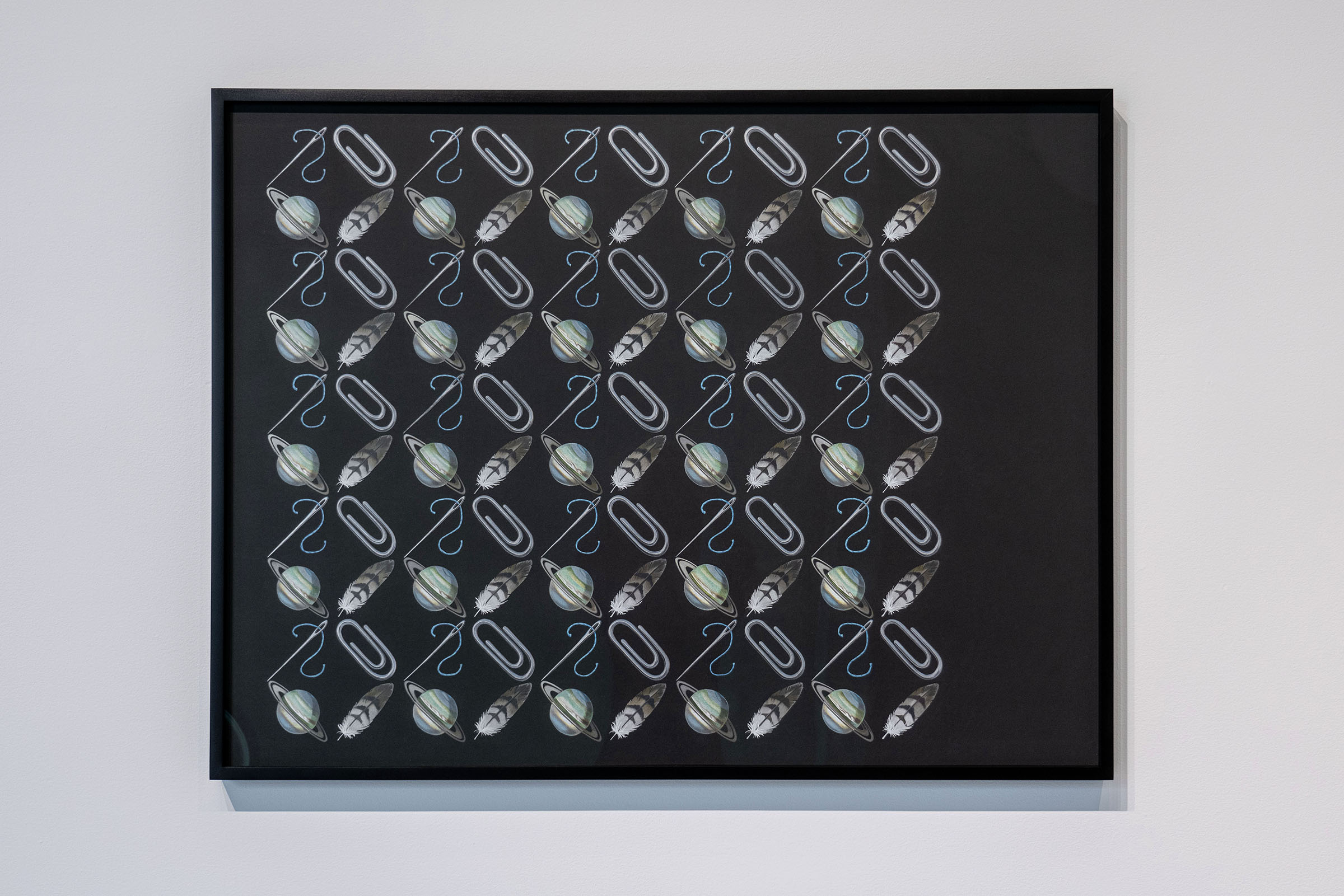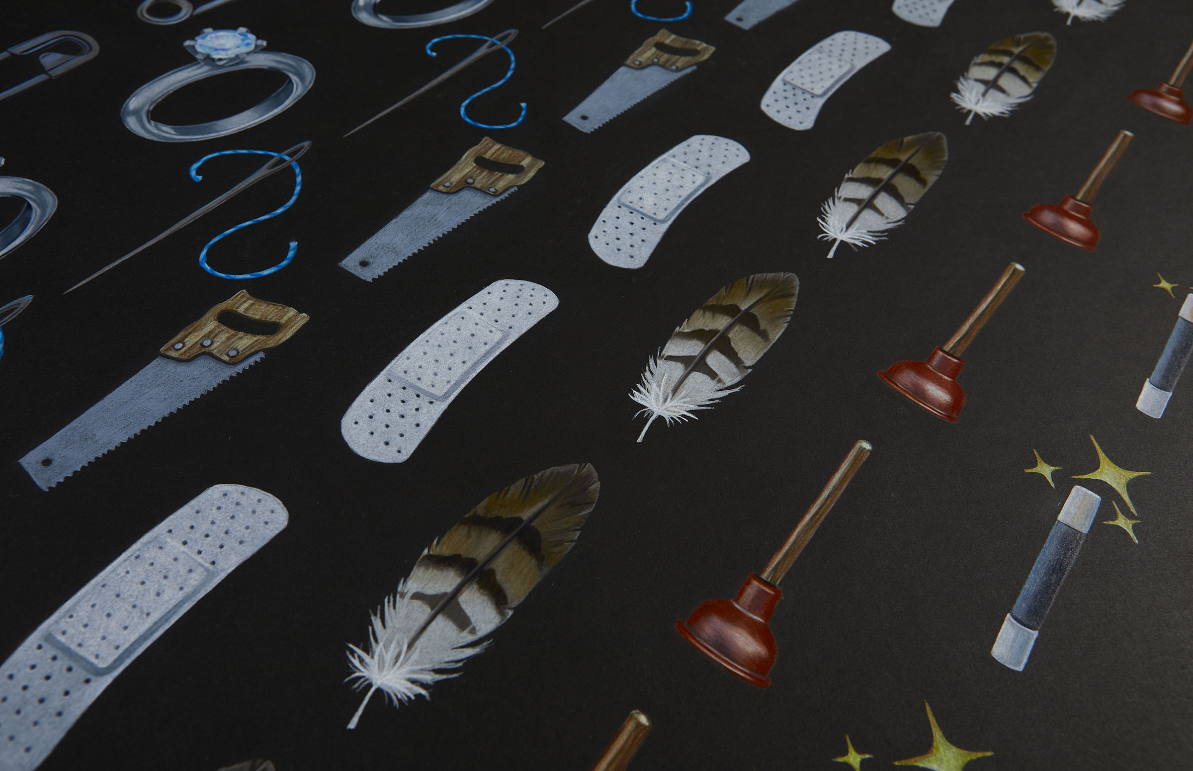 Each of the three drawings in this series uses pattern to animate the symbols that populate our phones. In one drawing, items of mending, tending, cutting, and repairing—and a little magic—repeat in a diagonal cascade, their replication a simultaneous assertion of presence and meaninglessness. In another, the slanted shapes of four emojis are arranged and repeated to evoke the traditional Tumbling Blocks quilt pattern. In a third drawing, the sheen on plastic and metallic surfaces pulls shapes from the black background; their materiality speaks to the elemental nature of all things: minerals that constitute rocks, copper that carries current, spoons that deliver nutrients to our stomachs, phone receivers that bring sound waves to our ear.