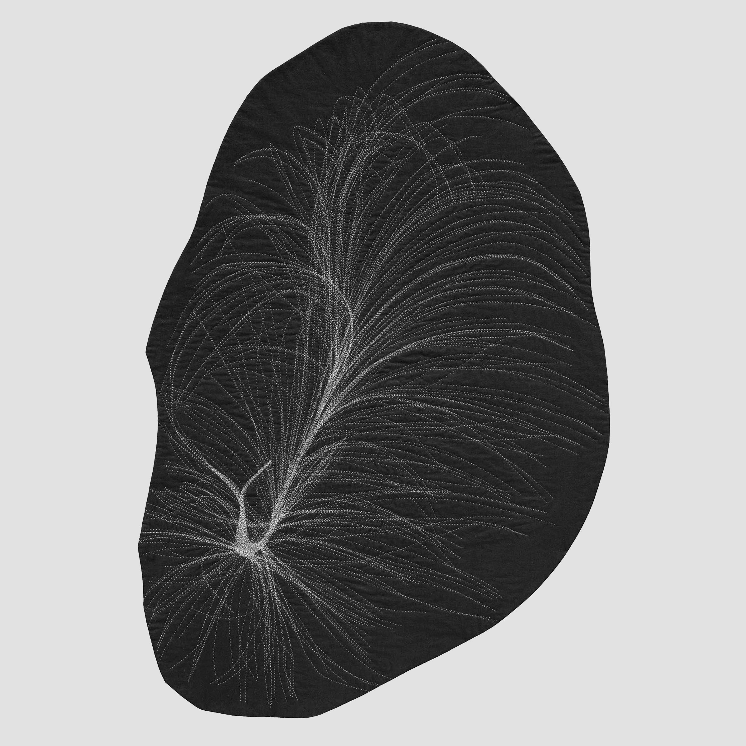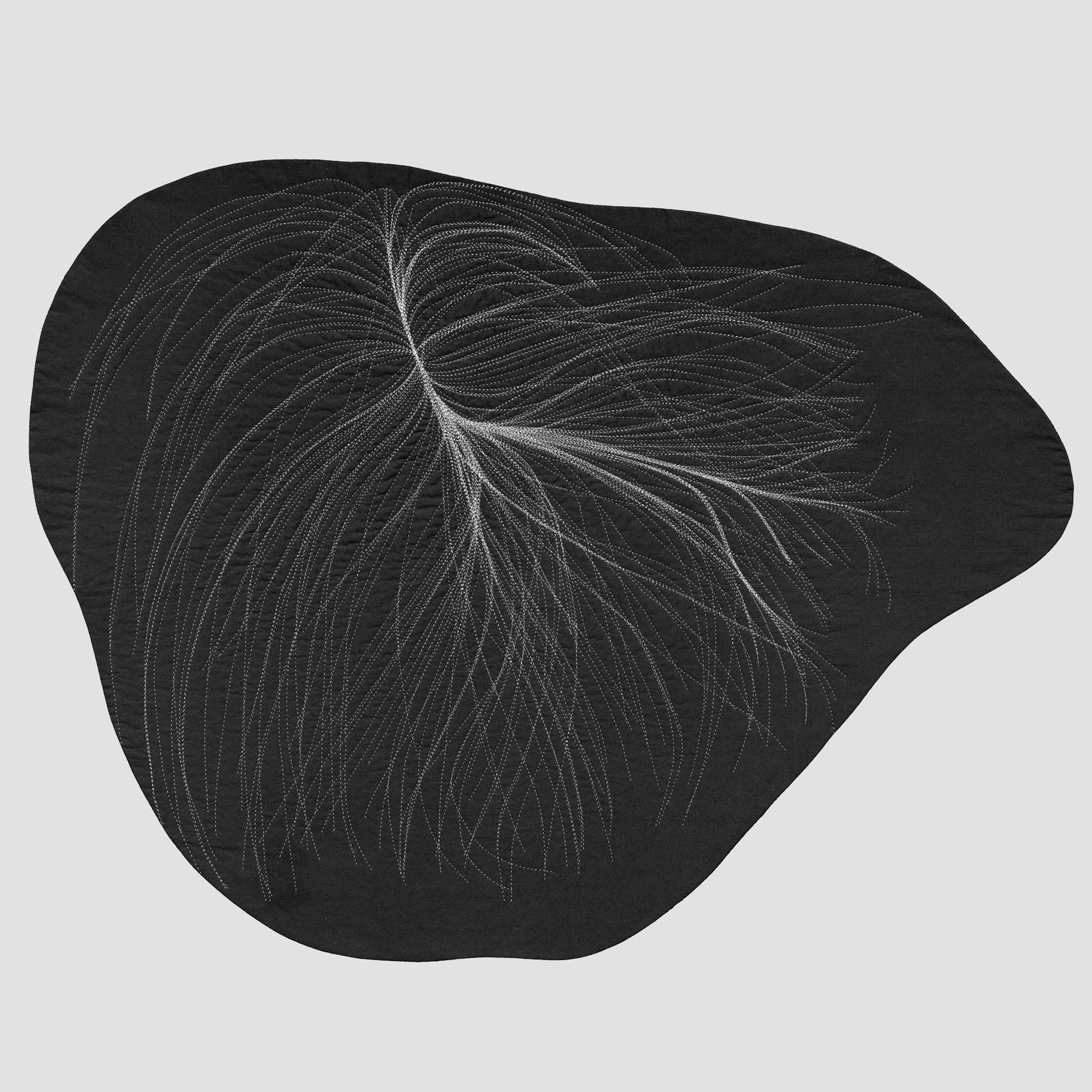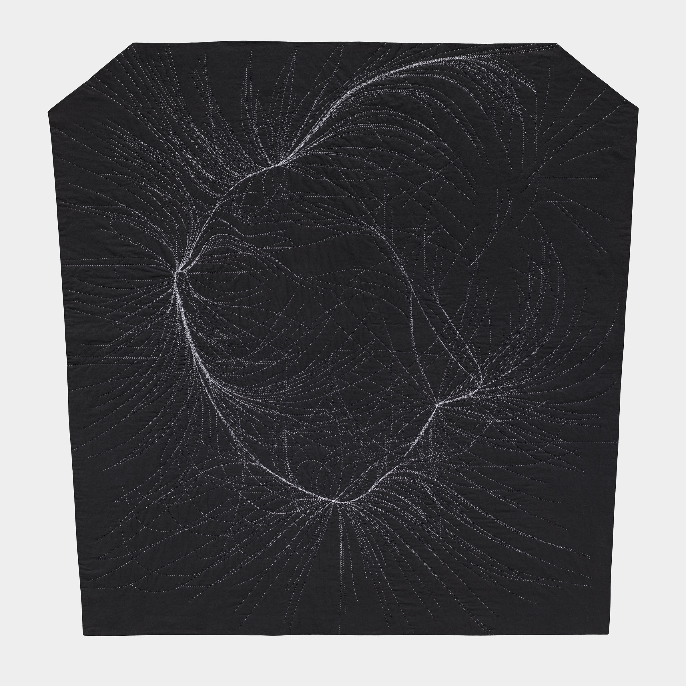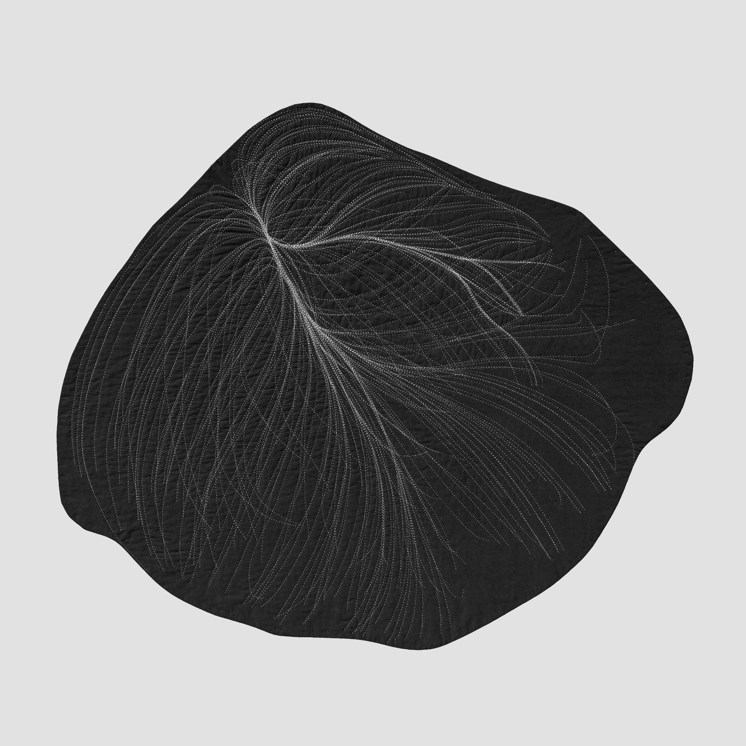 A conversation emerges between the intense amount of data and effort that goes into calculating these gravitational flows, transformed into a gesture drawing as I prep the fabric with chalk, then a return to slow deliberation and deciphering through the act of hand-stitching. Pairing the coldness and seduction of minimalism with the warmth and seduction of craft, this process of translation shifts the work between the intimate and the vast.