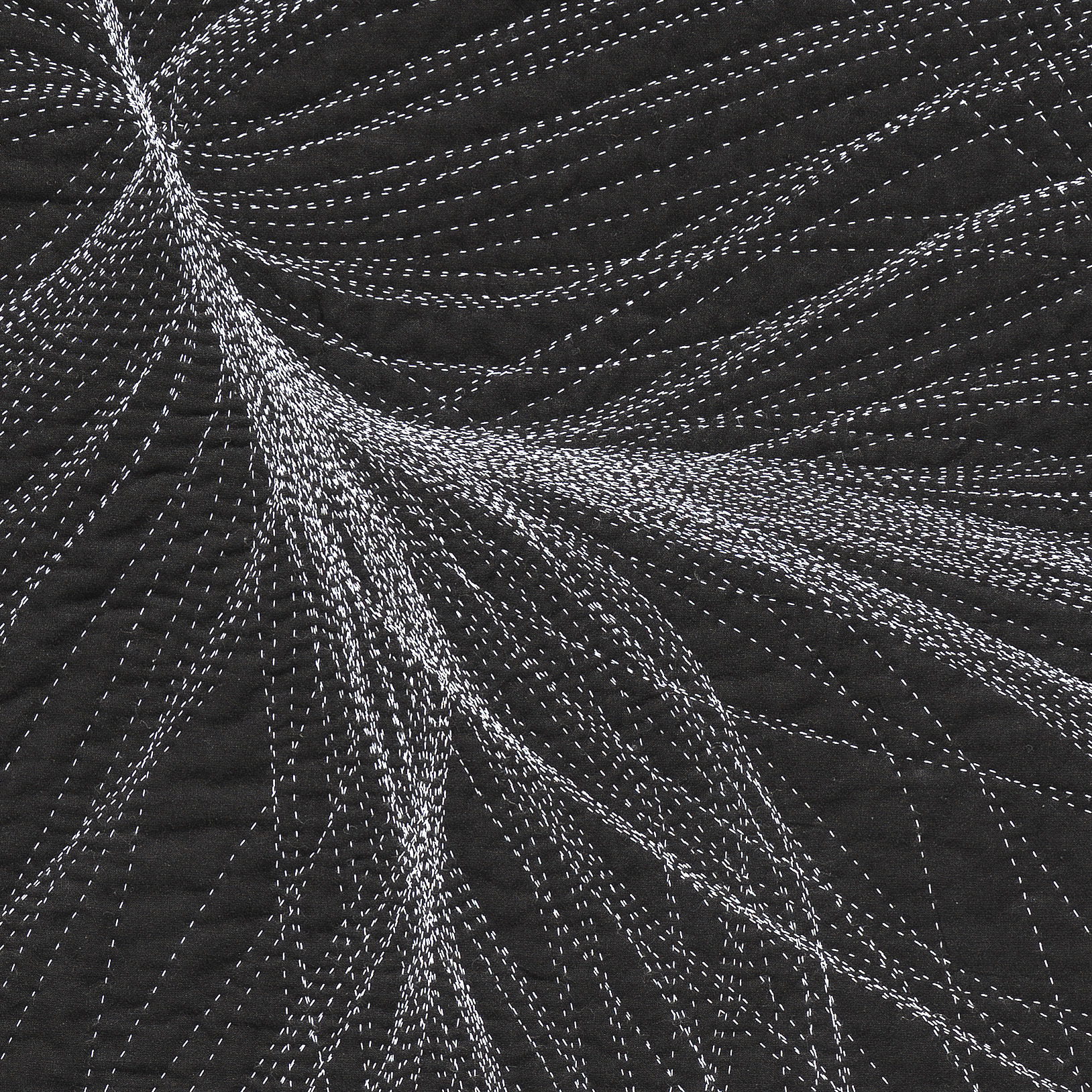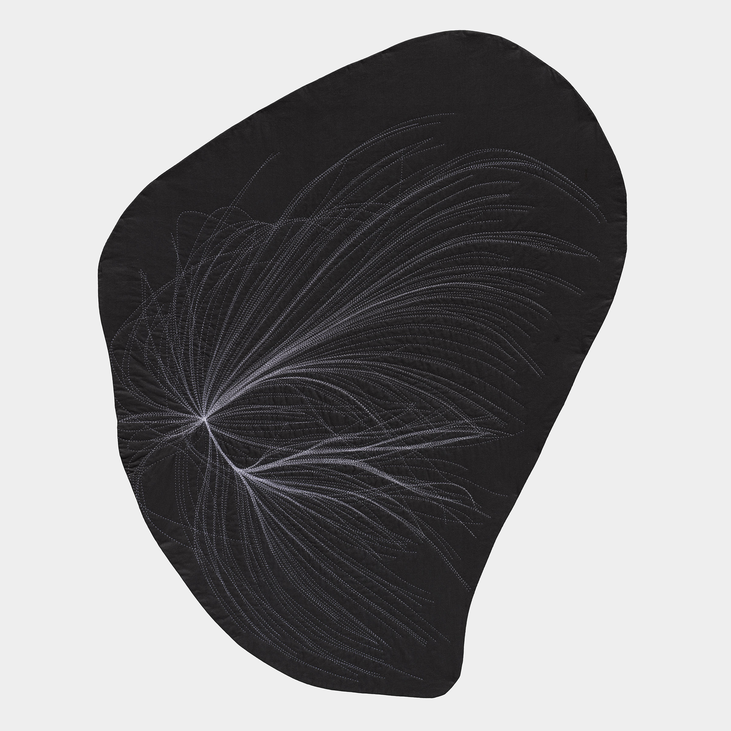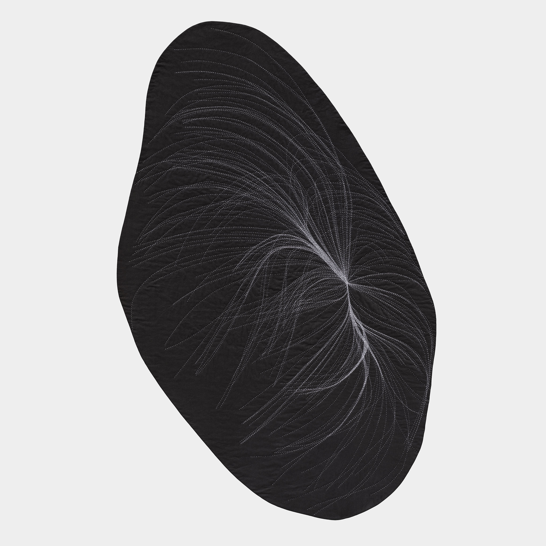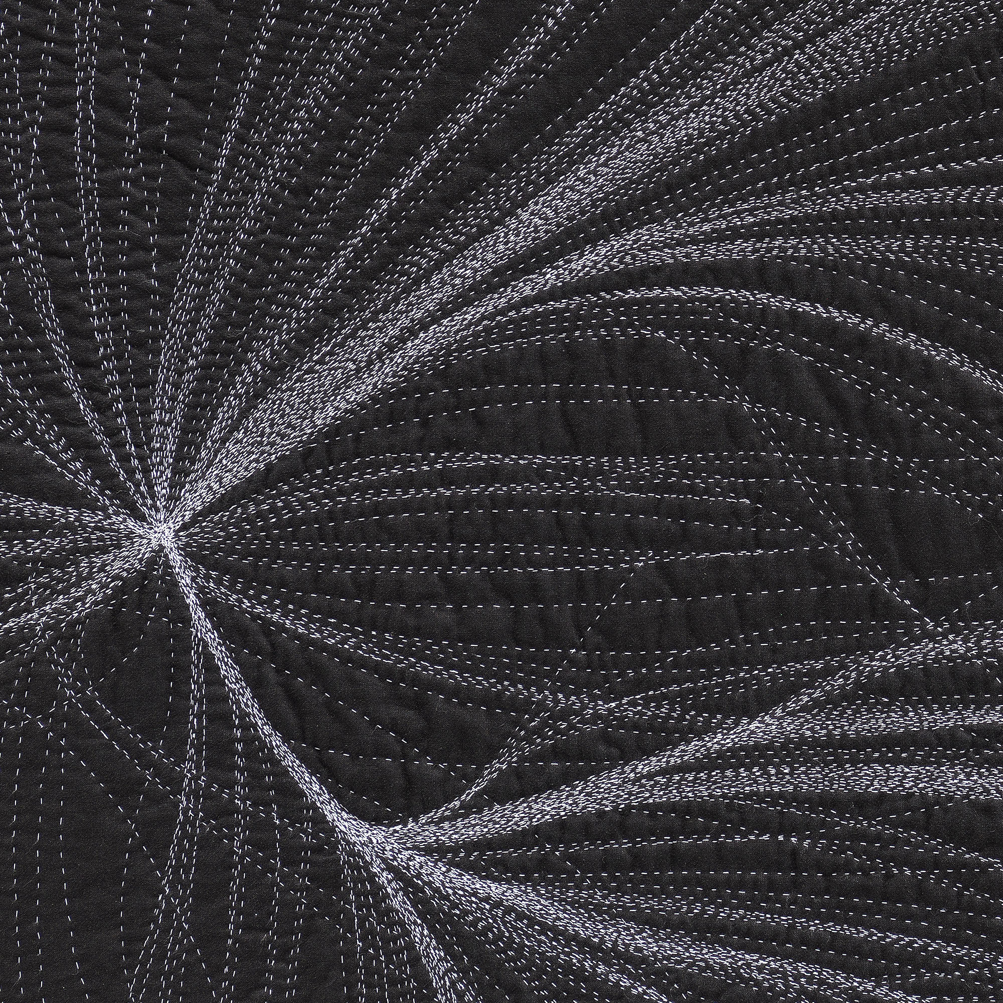 A conversation emerges between the intense amount of data and effort that goes into calculating these gravitational flows, transformed into a gesture drawing as I prep the fabric with chalk, then a return to slow deliberation and deciphering through the act of hand-stitching. Pairing the coldness and seduction of minimalism with the warmth and seduction of craft, this process of translation shifts the work between the intimate and the vast.