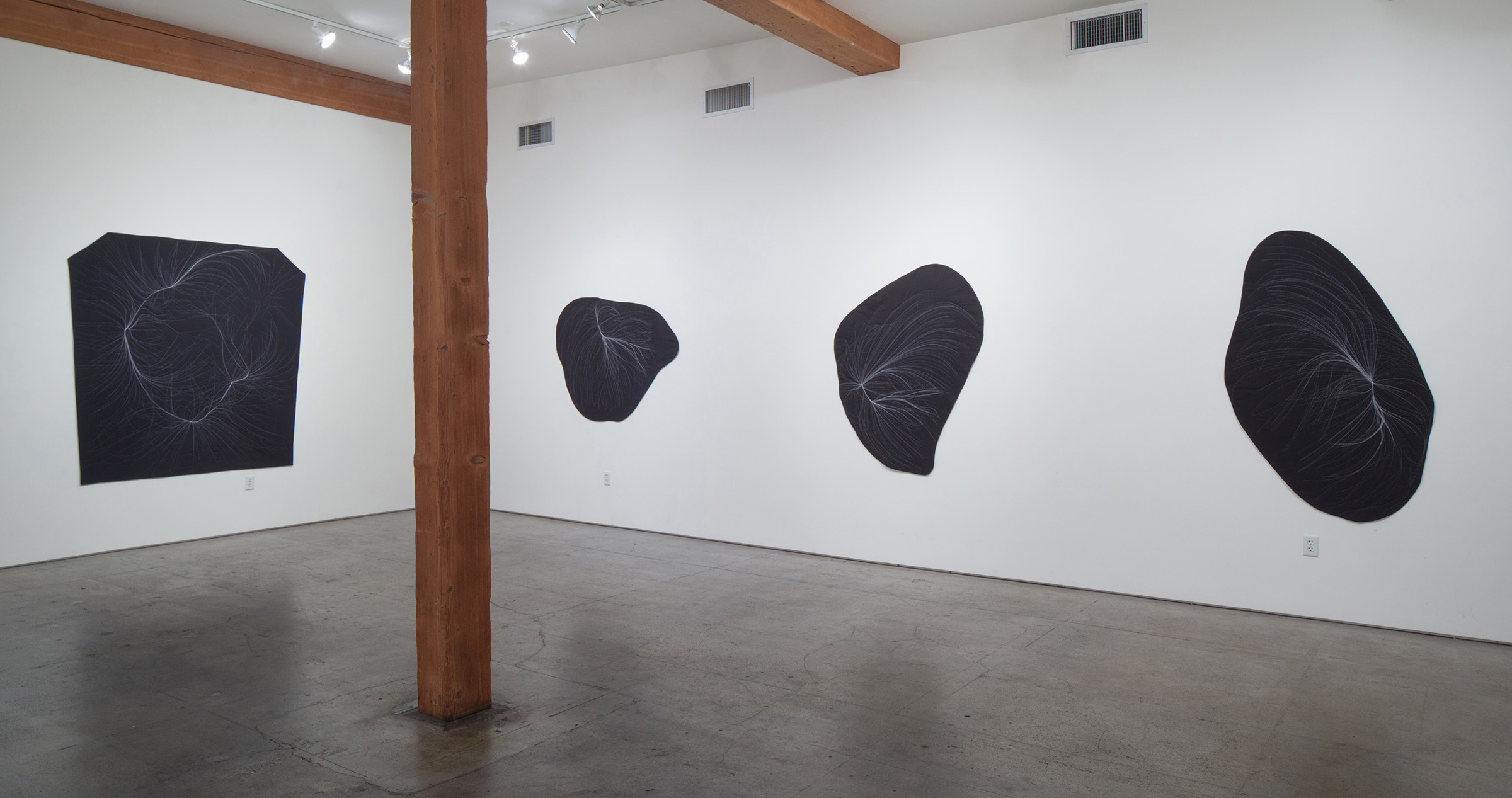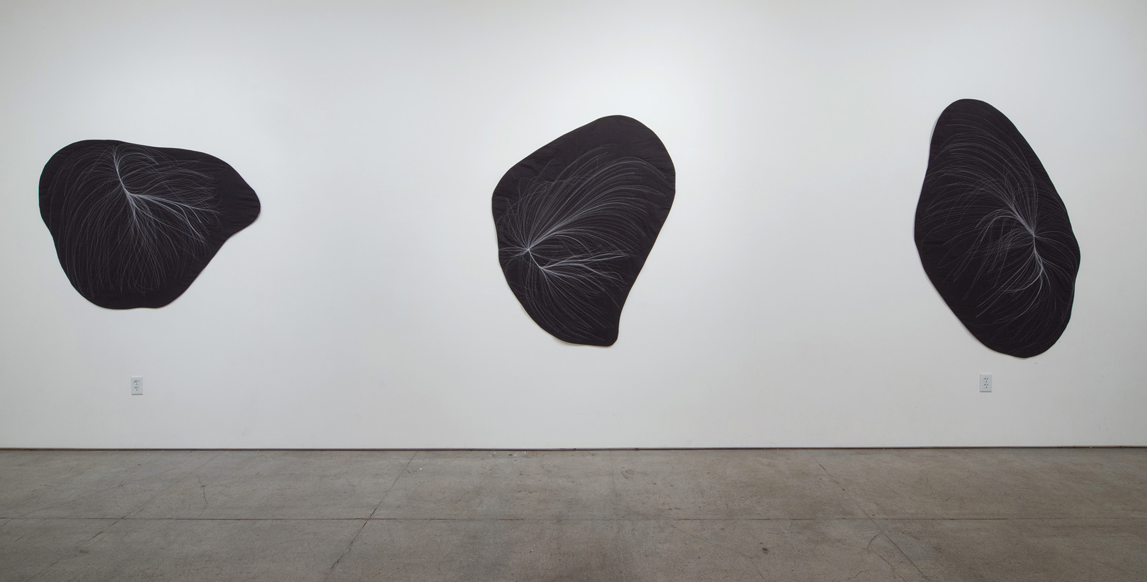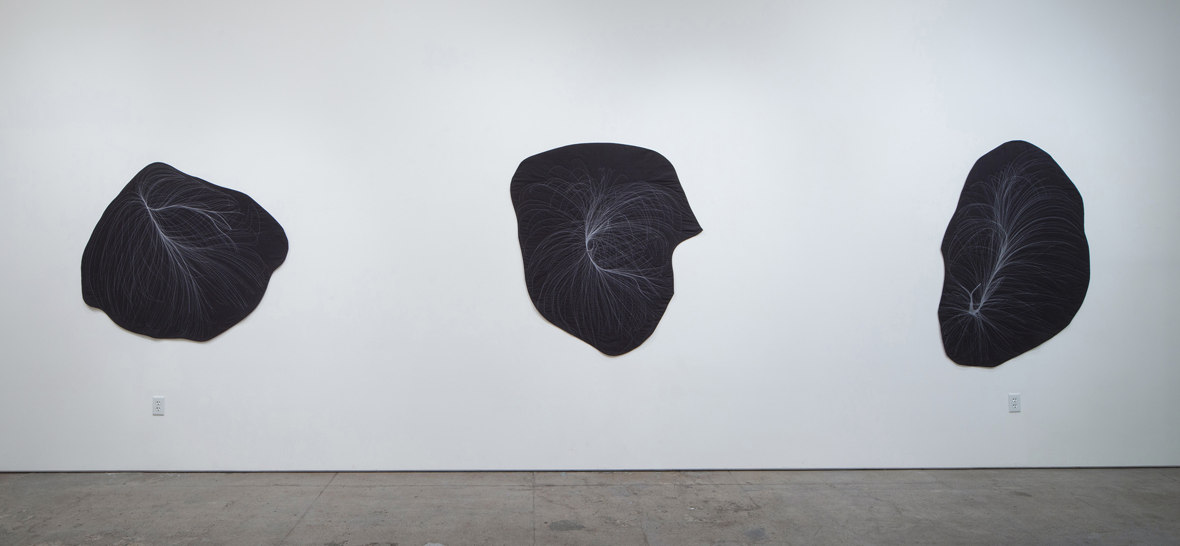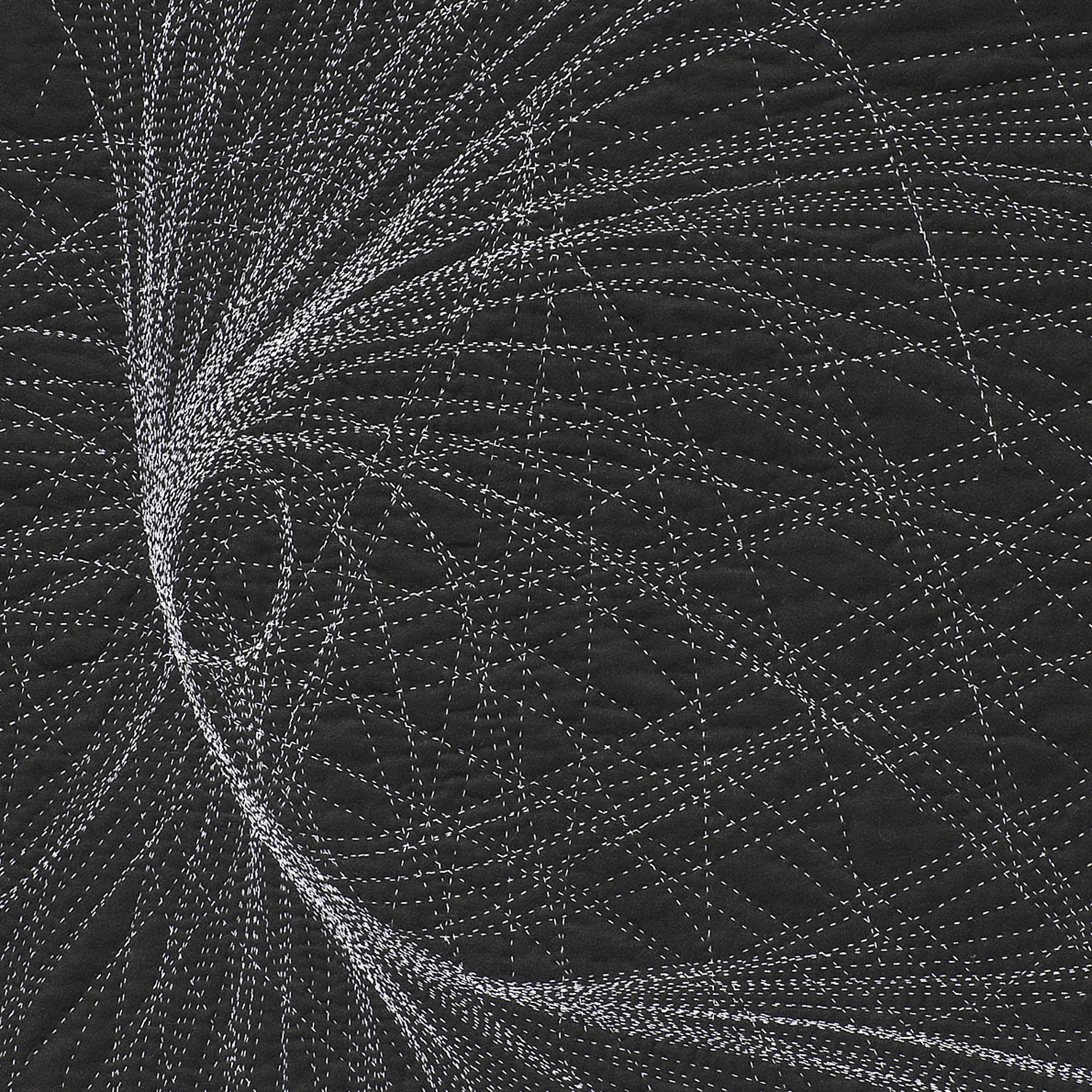 A conversation emerges between the intense amount of data and effort that goes into calculating these gravitational flows, transformed into a gesture drawing as I prep the fabric with chalk, then a return to slow deliberation and deciphering through the act of hand-stitching. Pairing the coldness and seduction of minimalism with the warmth and seduction of craft, this process of translation shifts the work between the intimate and the vast.